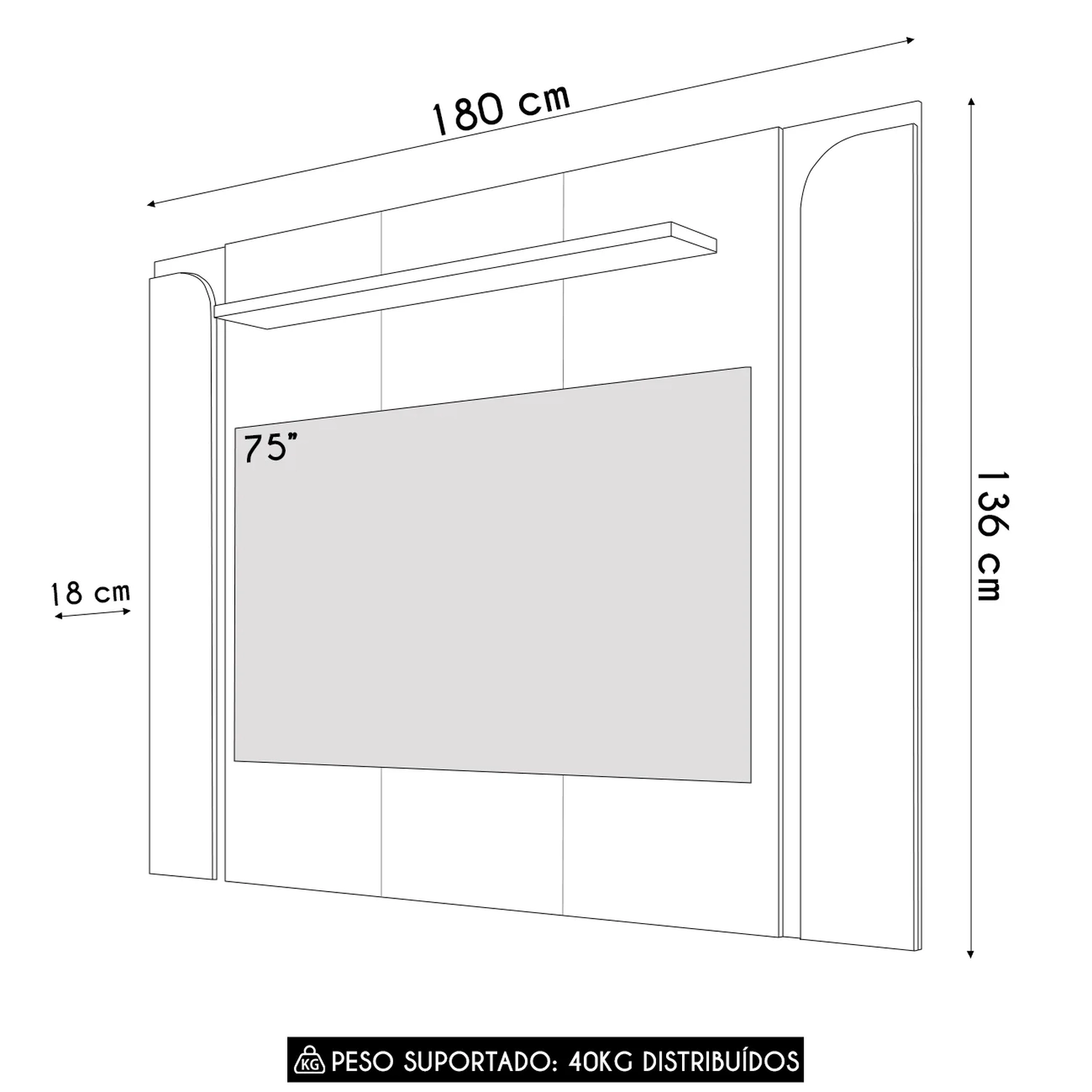 A prateleira superior oferece robustez e resistência, sendo perfeita para suportar diversos itens decorativos ou tecnológicos. Com seu acabamento de alta qualidade, ela adiciona um toque moderno ao design do Painel de TV.