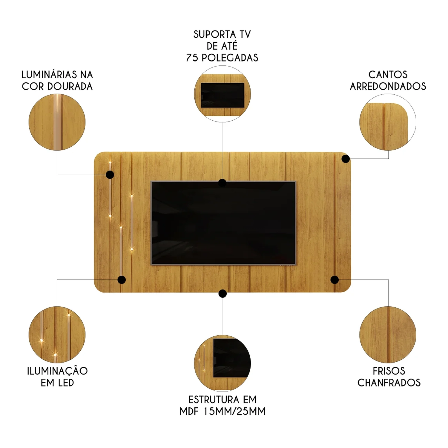 Se você busca sofisticação e elegância para sua Sala de Estar, este painel é uma excelente escolha. Com charmosos cantos arredondados e bordas chanfradas, ele cria um detalhe decorativo único, emoldurando o amplo espaço que acomoda TV de até 75 polegadas, garantindo o melhor entretenimento para sua família. Além disso, o Painel Suspenso conta com luminárias douradas, adicionando um toque extra de elegância ao conjunto. Produzido 100% em MDF, com madeira de reflorestamento. Este Painel para TV é cheio de benefícios, perfeito para dar aquele toque especial na sua sala, criando um ambiente moderno, aconchegante e repleto de classe.