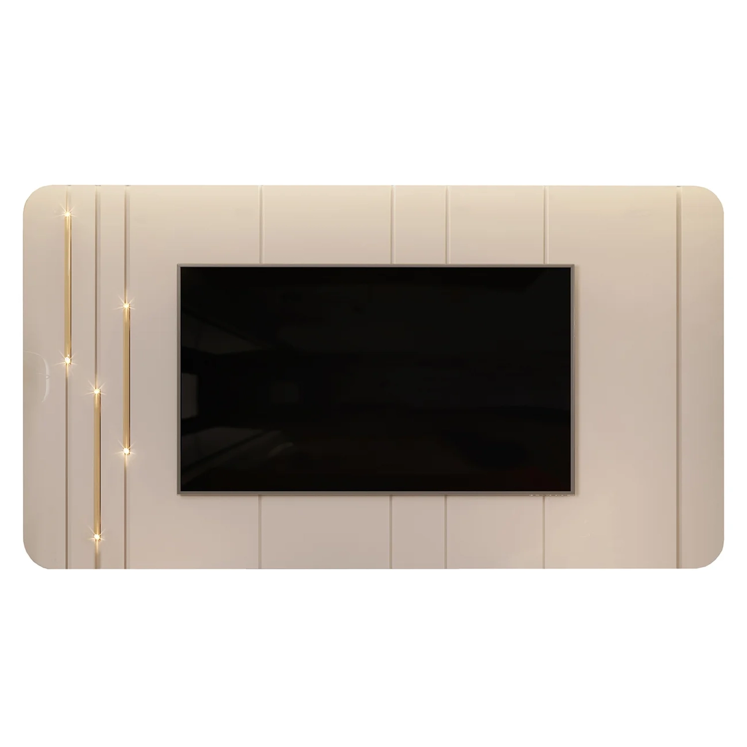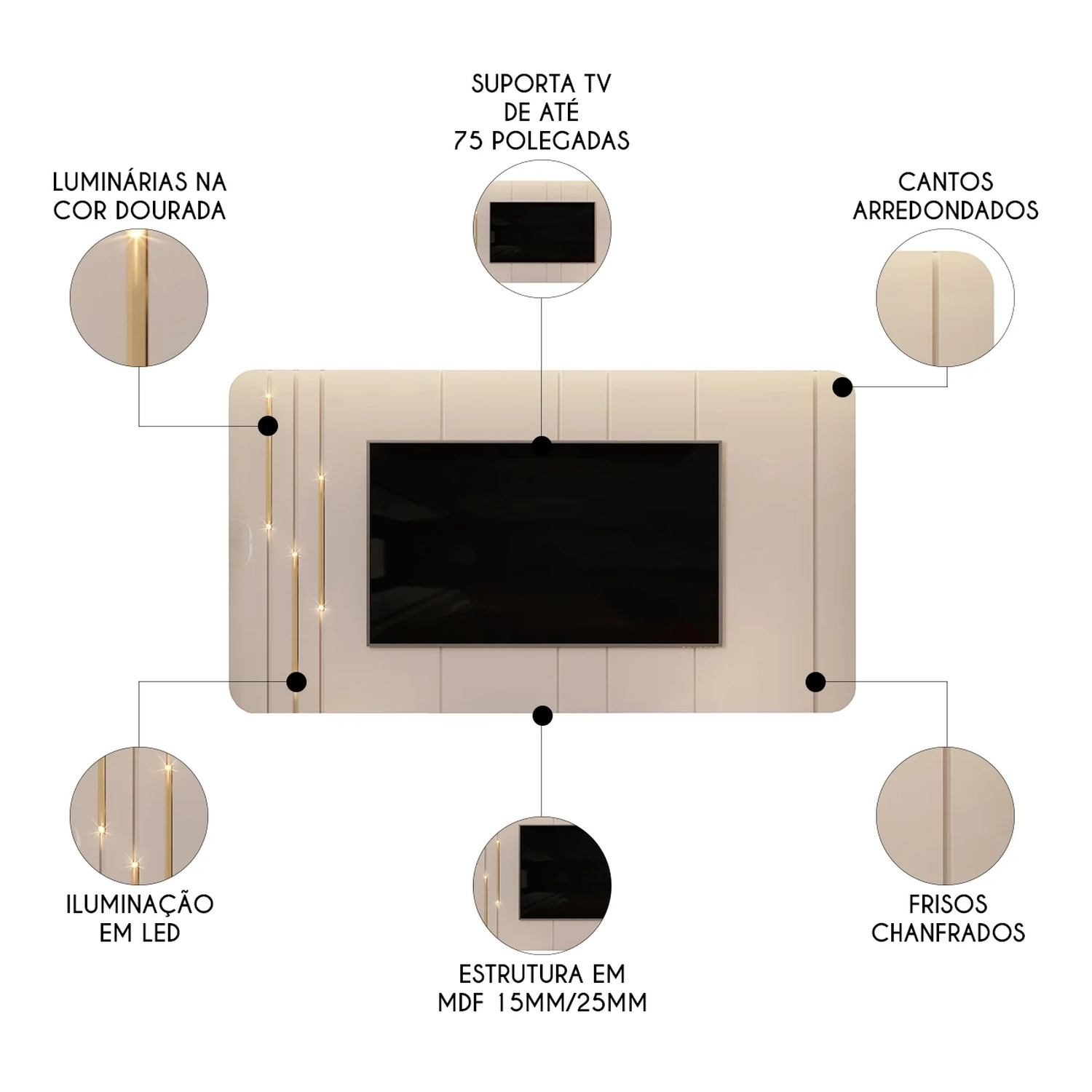 Se você busca sofisticação e elegância para sua Sala de Estar, este painel é uma excelente escolha. Com charmosos cantos arredondados e bordas chanfradas, ele cria um detalhe decorativo único, emoldurando o amplo espaço que acomoda TV de até 75 polegadas, garantindo o melhor entretenimento para sua família. Além disso, o Painel Suspenso conta com luminárias douradas, adicionando um toque extra de elegância ao conjunto. Produzido 100% em MDF, com madeira de reflorestamento. Este Painel para TV é cheio de benefícios, perfeito para dar aquele toque especial na sua sala, criando um ambiente moderno, aconchegante e repleto de classe.