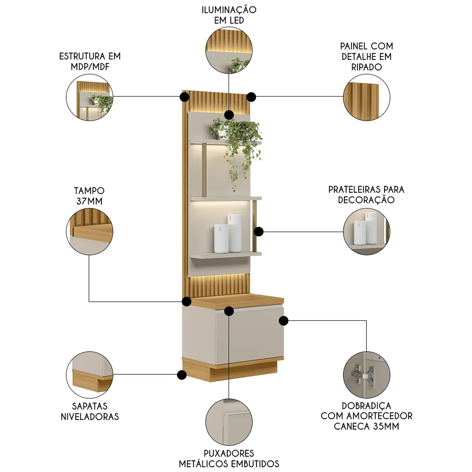 - Painel com detalhe ripado e luminária LED.