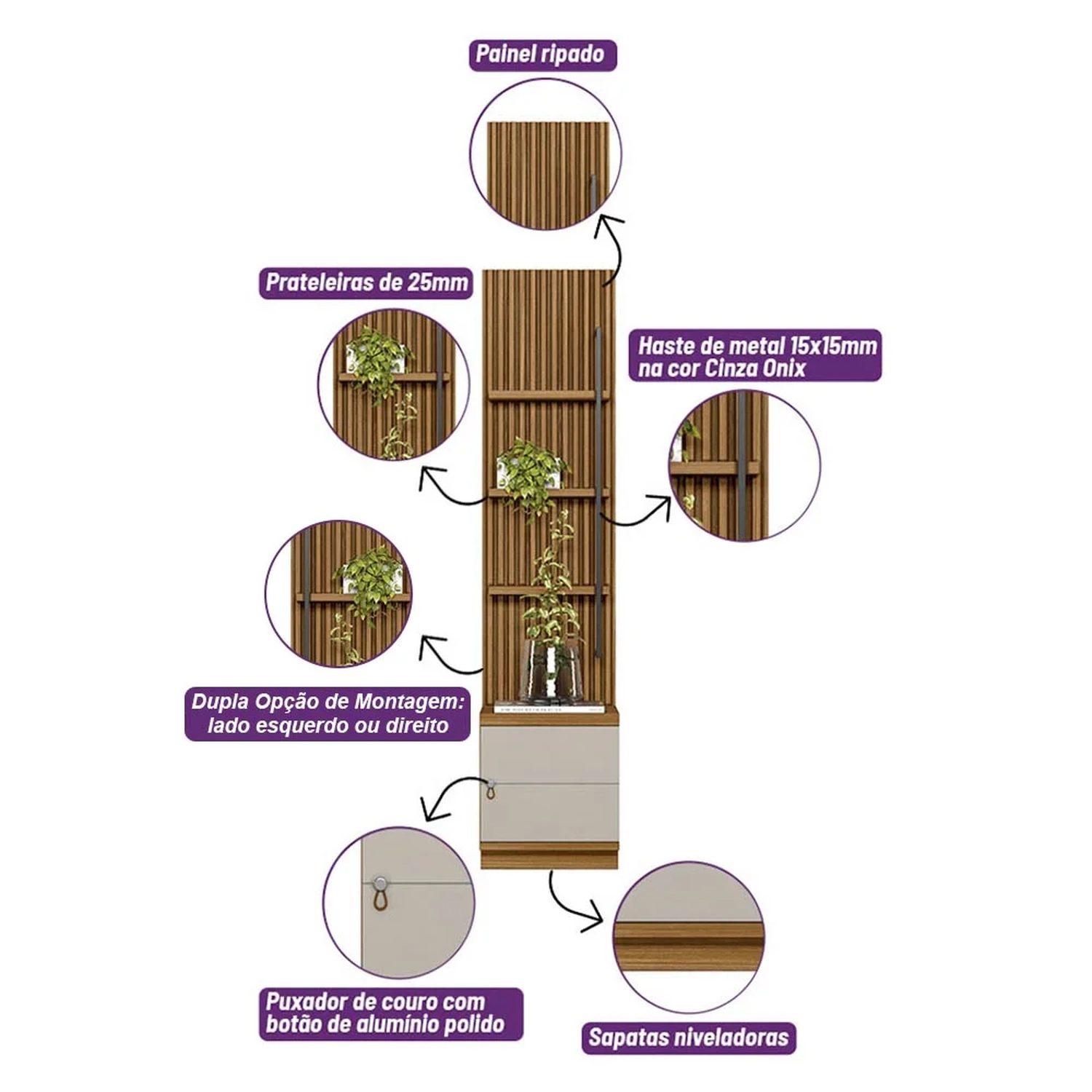 Desenvolvido para agregar medida e estilo quando combinado ao rack com painel ripado da Linha Golden, esse módulo alia a contemporaneidade do ripado com o estilo industrial presente nas hastes metálicas que destacam as prateleiras. Mas engana-se quem pensa que ele pode ser aproveitado somente na sala de estar, pois o seu design permite utilizá-lo também como mesa de cabeceira. Ah! Ele pode ser montado do lado esquerdo ou direito, basta usar a imaginação e harmonizá-lo com os demais móveis do quarto e pronto. Demais não é mesmo?