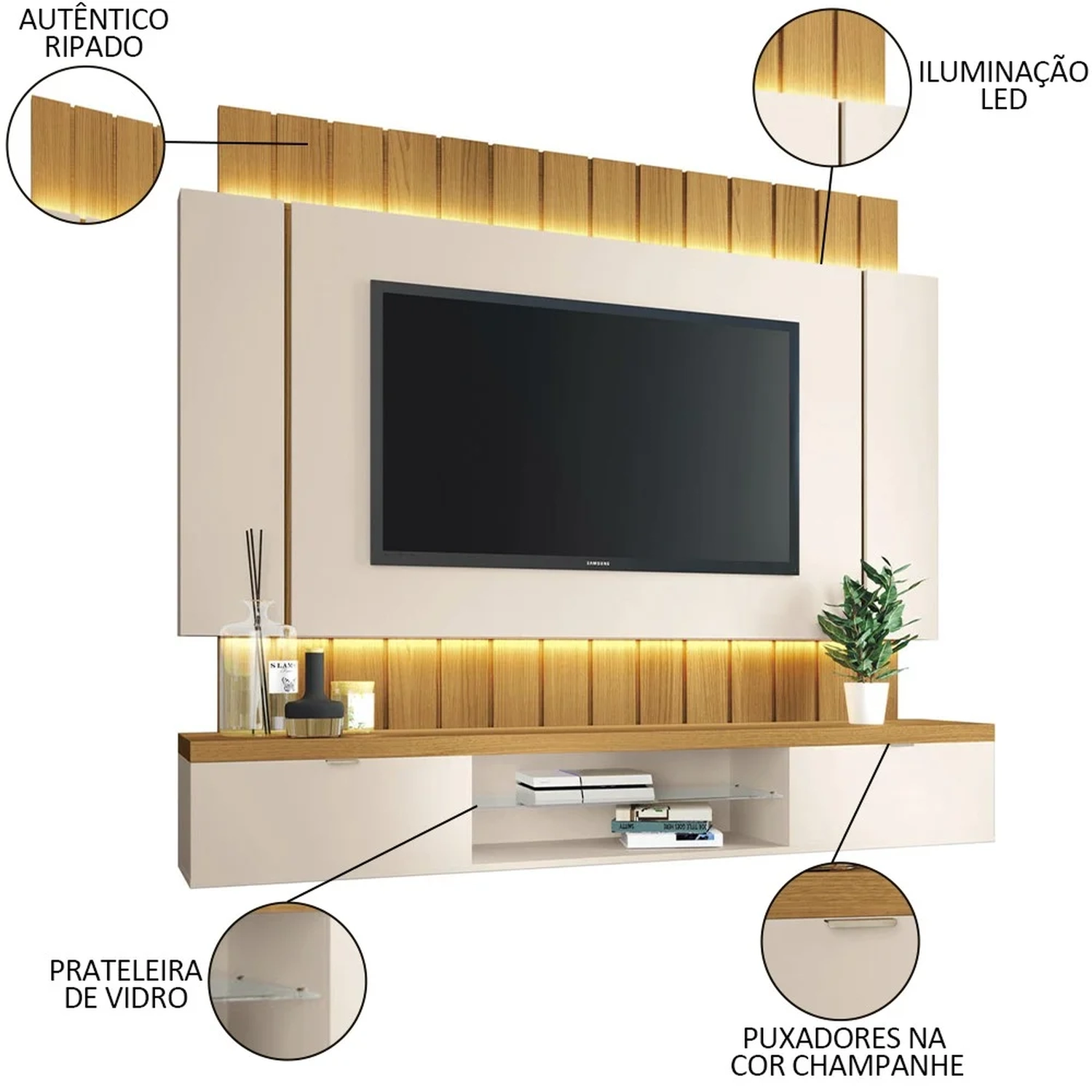 Produzido em MDF/MDP e com pintura UV, o Painel de TV possui 2 portas basculantes com puxadores na cor champanhe, que oferecem espaço para guardar objetos e acessórios. Além disso, ele conta com uma prateleira de vidro que pode ser usada para expor itens decorativos ou aparelhos eletrônicos. O detalhe em madeira ripada na parte superior do painel confere um toque de sofisticação e elegância ao ambiente. O Painel Suspenso suporta TV de até 55 polegadas e possui iluminação em LED, que cria um efeito aconchegante e charmoso. Ele é ideal para quem quer aproveitar melhor o espaço da sala e valorizar o seu estilo.