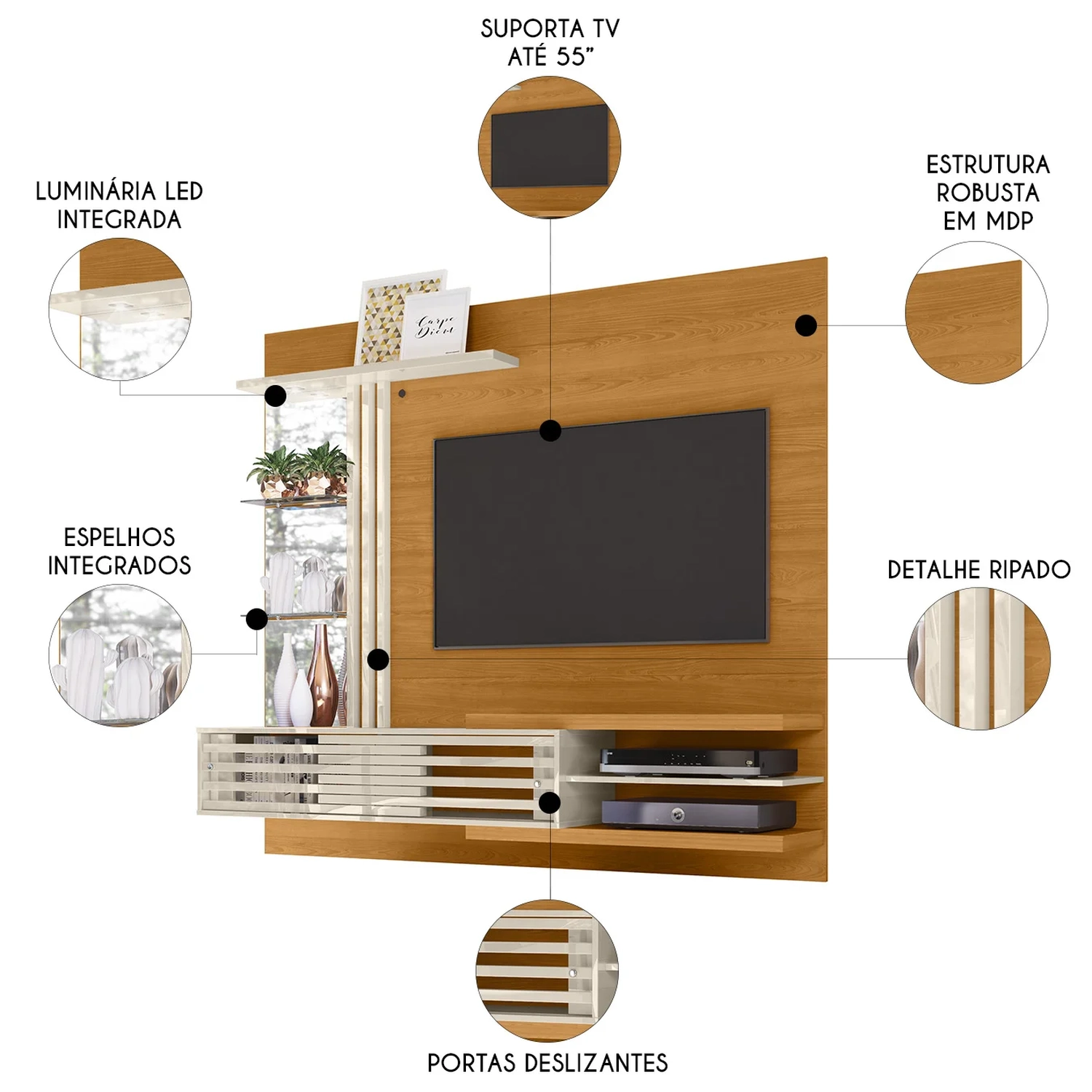 Esse conjunto harmoniza funcionalidade e um design incrível, oferecendo praticidade e elegância em um único produto. Com capacidade para TVs de até 55 Polegadas, O Painel de TV proporciona um suporte seguro e um visual organizado. Os três espelhos estrategicamente posicionados criam uma sensação de amplitude no ambiente, enquanto as duas prateleiras de vidro se destacam com o auxílio da luminária de LED integrada, ideal para exibir objetos decorativos com requinte. A Bancada Para TV conta com duas portas deslizantes no estilo Frizz, que, além de facilitarem o acesso, conferem um toque moderno ao móvel. Os três nichos são perfeitos para acomodar equipamentos eletrônicos e itens decorativos de forma prática e organizada. Produzido com materiais de alta qualidade e acabamentos diferenciados, o Painel e Bancada Suspensa transforma sua sala em um espaço acolhedor, moderno e cheio de estilo.