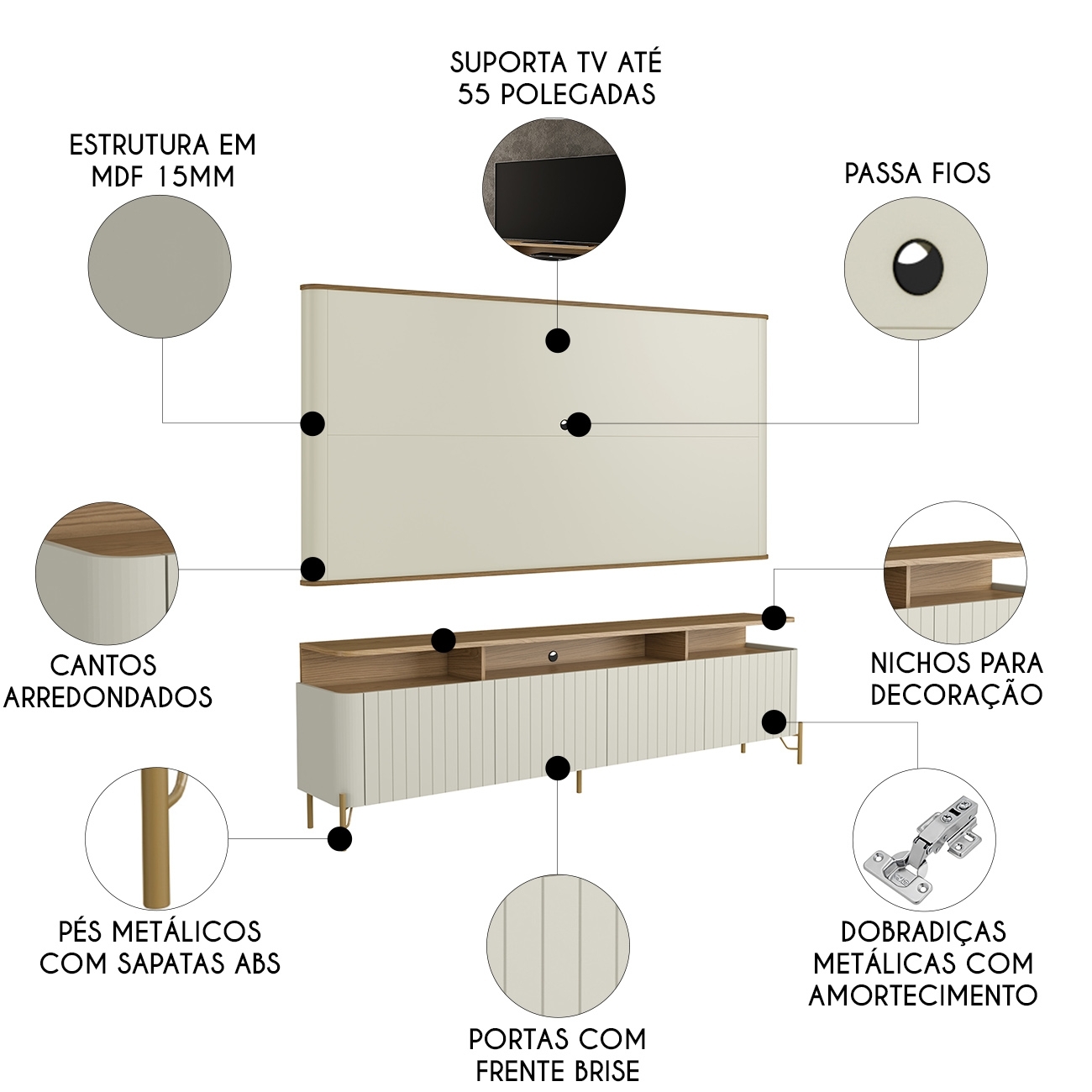 Painel TV 55 Pol e Rack Sala Porta Brise Blen Louro/Luna/Dourado I06 - Mpozenato