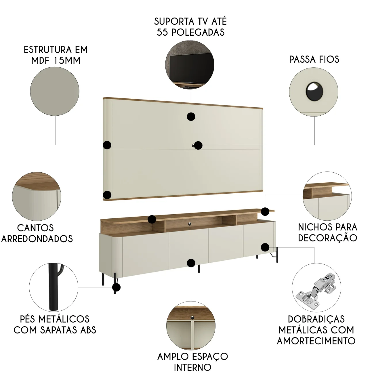 O Rack Moderno conta ainda com pés metálicos com pintura epóxi e sapatas plásticas que protegem o piso, além de dobradiças com amortecedor que asseguram suavidade no fechamento das portas. Um móvel versátil, pensado para unir beleza, segurança e praticidade.