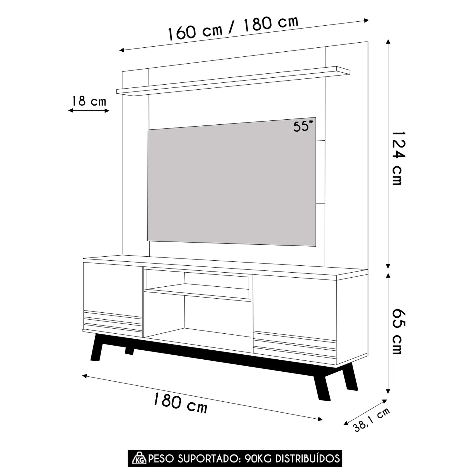 Painel Extensível: 160 até 180cm x 124cm x 18cm.