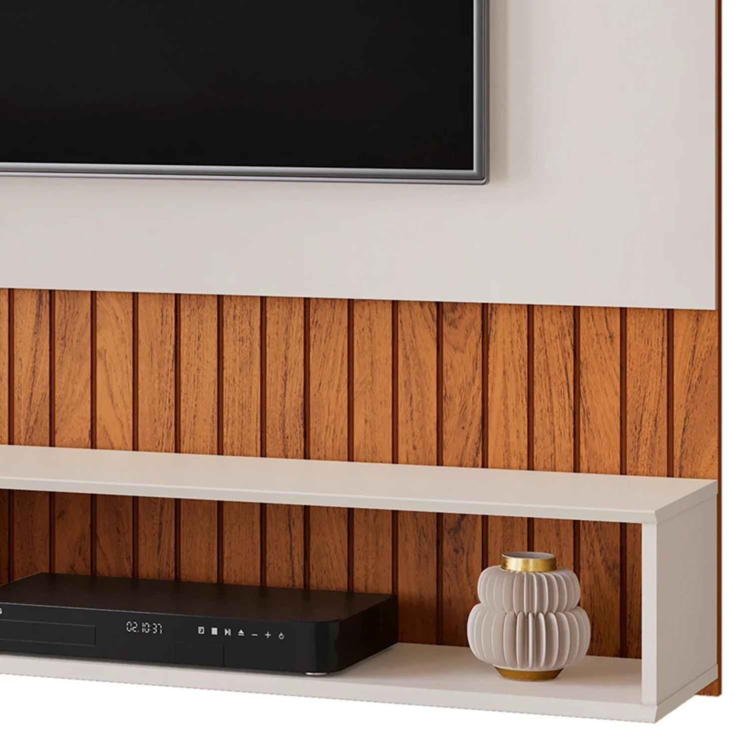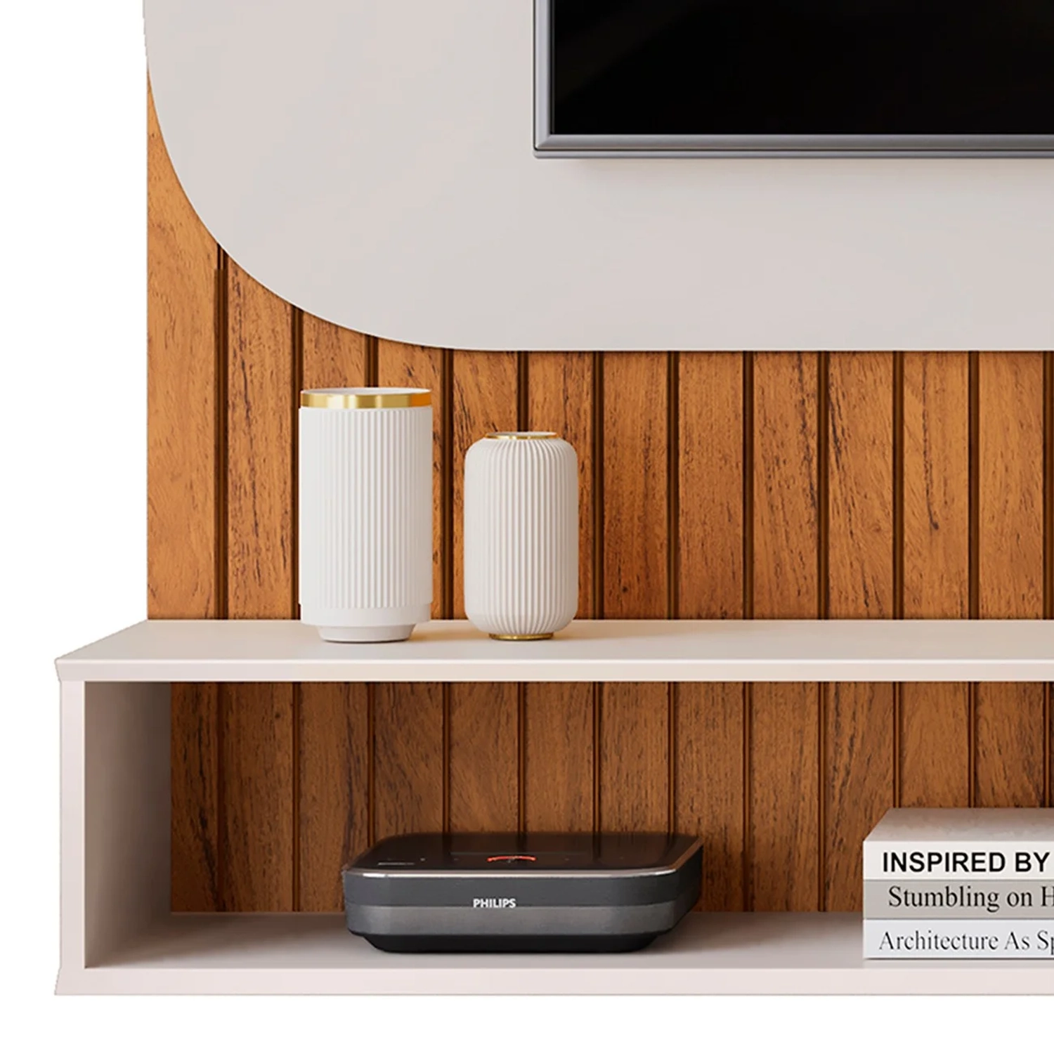 Com capacidade para suportar TVs de até 65 polegadas, este Painel permite que você escolha a TV ideal, garantindo uma experiência de entretenimento completa e sem preocupações. Sua estrutura é fabricada com peças de MDP/MDF de 12mm/15mm e acabamento em pintura UV, proporcionando alta resistência e durabilidade. A bancada suspensa com porta deslizante oferece nicho para armazenar seus itens, exibir objetos decorativos e acomodar eletrônicos de forma harmoniosa. Seu design contrasta elegantemente com os frisos do Painel Ripado, enquanto o detalhe central com cantos arredondados realça a beleza do móvel, emoldurando a TV de forma graciosa e sofisticada. Também dispõe de passa-fios para facilitar a organização e ocultar os cabos, preservando uma estética clean em seu ambiente.