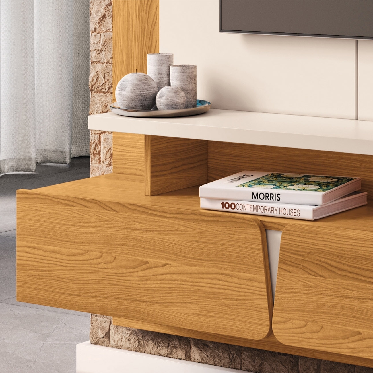 O Design Moderno se destaca pelas portas basculantes com detalhes curvos, que agregam sofisticação ao ambiente e oferecem amplo espaço interno para eletrônicos e organização funcional.