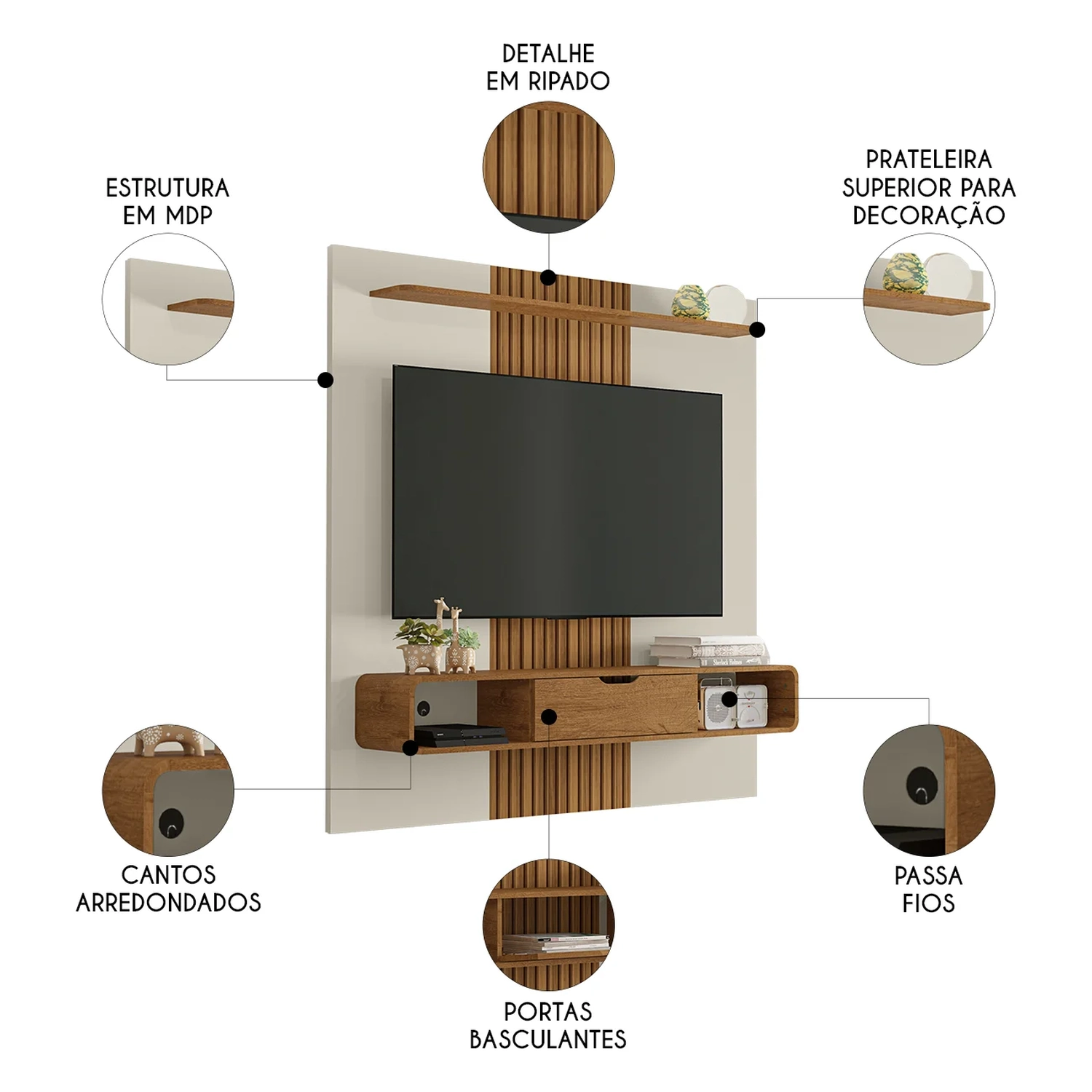A prateleira superior também possui cantos curvos, reforçando a proposta de um móvel com design inovador. Produzido em MDP, o Painel Suspenso garante resistência e durabilidade, sendo uma peça completa para sua sala.