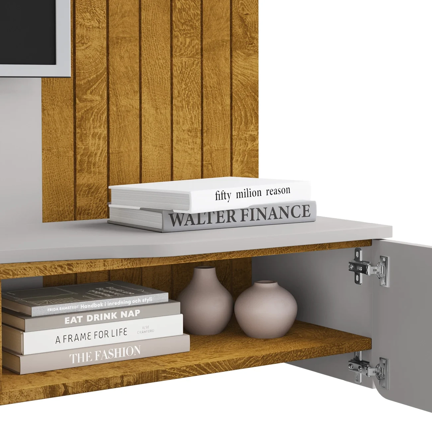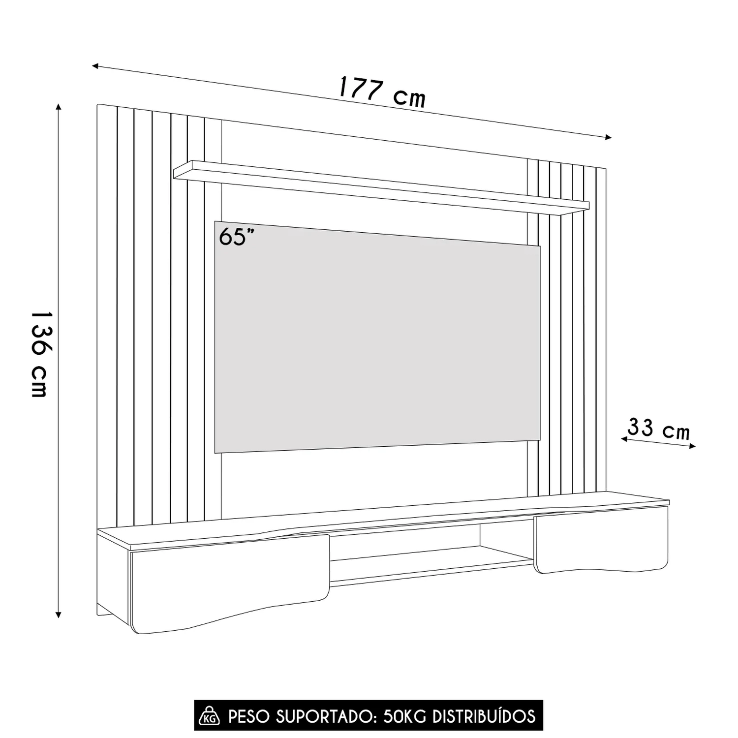 O Painel Bancada conta com acabamento frisado, que confere um visual moderno e elegante. Possui uma prateleira superior robusta de 25mm, ideal para livros, quadros ou objetos de uso diário, valorizando ainda mais o móvel.