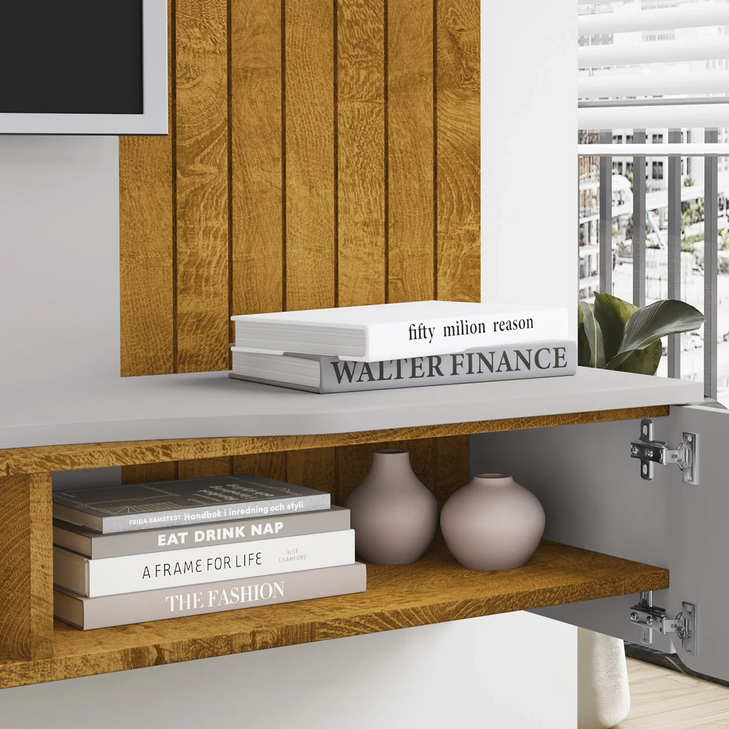 O Painel Para TV também dispõe de um nicho externo, ideal para acomodar objetos decorativos ou eletrônicos de forma prática e organizada.