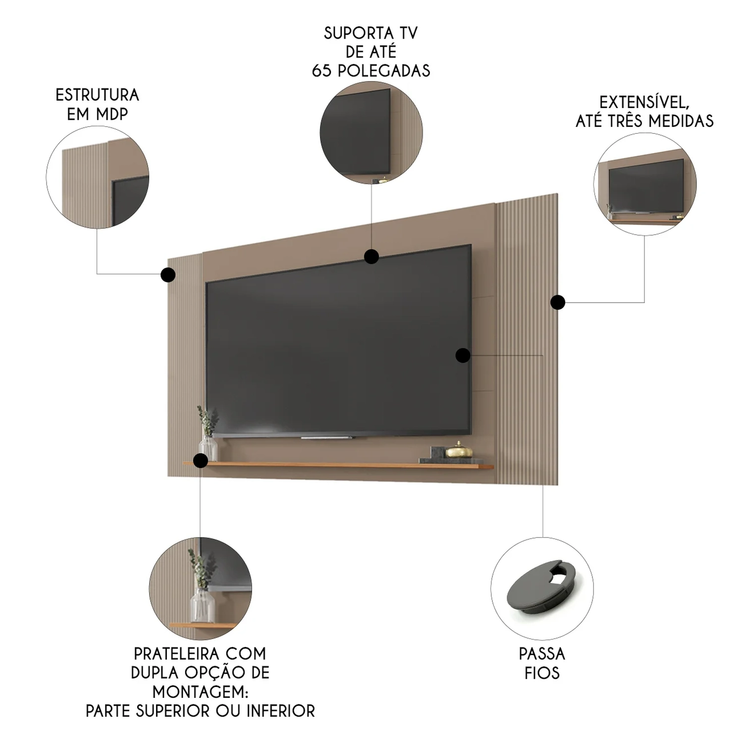 Fabricado em MDP, o painel garante a qualidade e a longevidade que você procura em um móvel. A prateleira de 25mm proporciona o espaço ideal para exibir objetos decorativos, podendo ser montada na parte superior ou inferior do painel.
