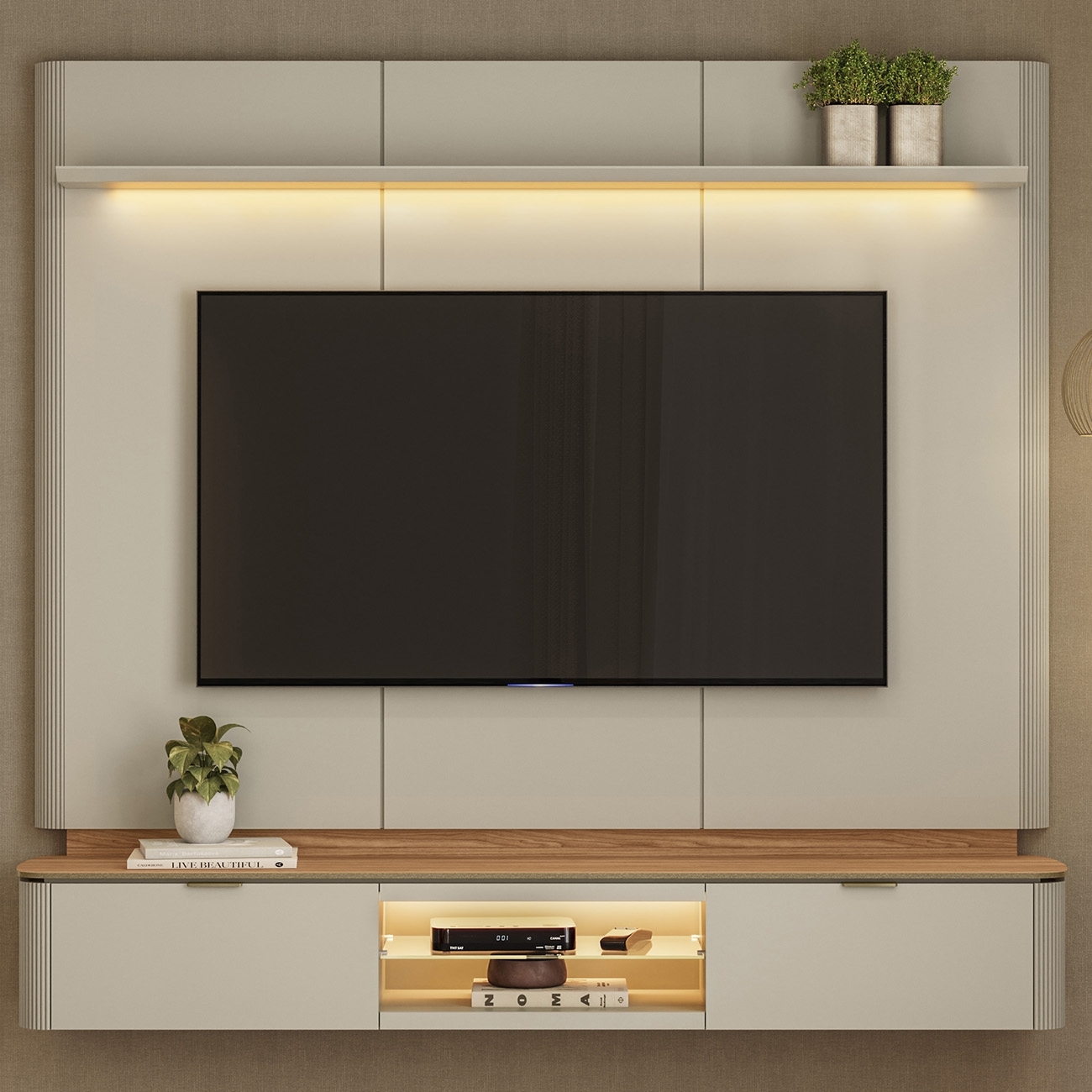 A composição conta com iluminação integrada que realça nichos e superfícies, criando um efeito visual sofisticado. A presença da Iluminação Led destaca objetos decorativos e traz mais aconchego ao espaço.