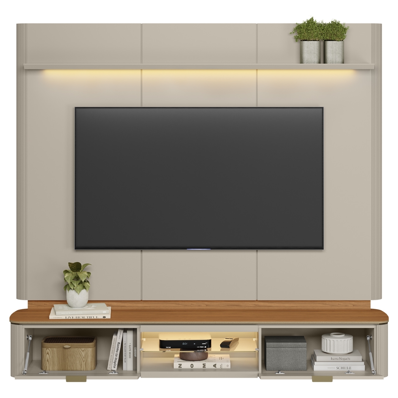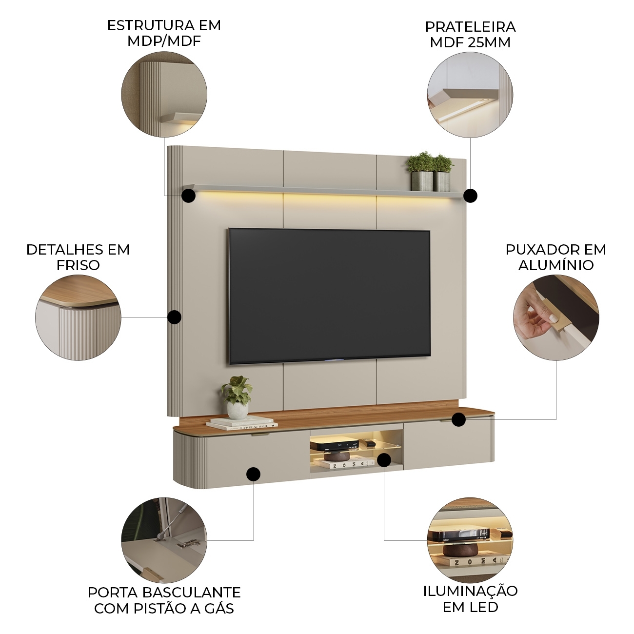 A estrutura é enriquecida por portas basculante com pistão à gás, cantos curvos com detalhe canelado nas laterais e puxador em alumínio. O conjunto oferece funcionalidade e estética equilibrada para quem busca um Painel Para TV imponente.