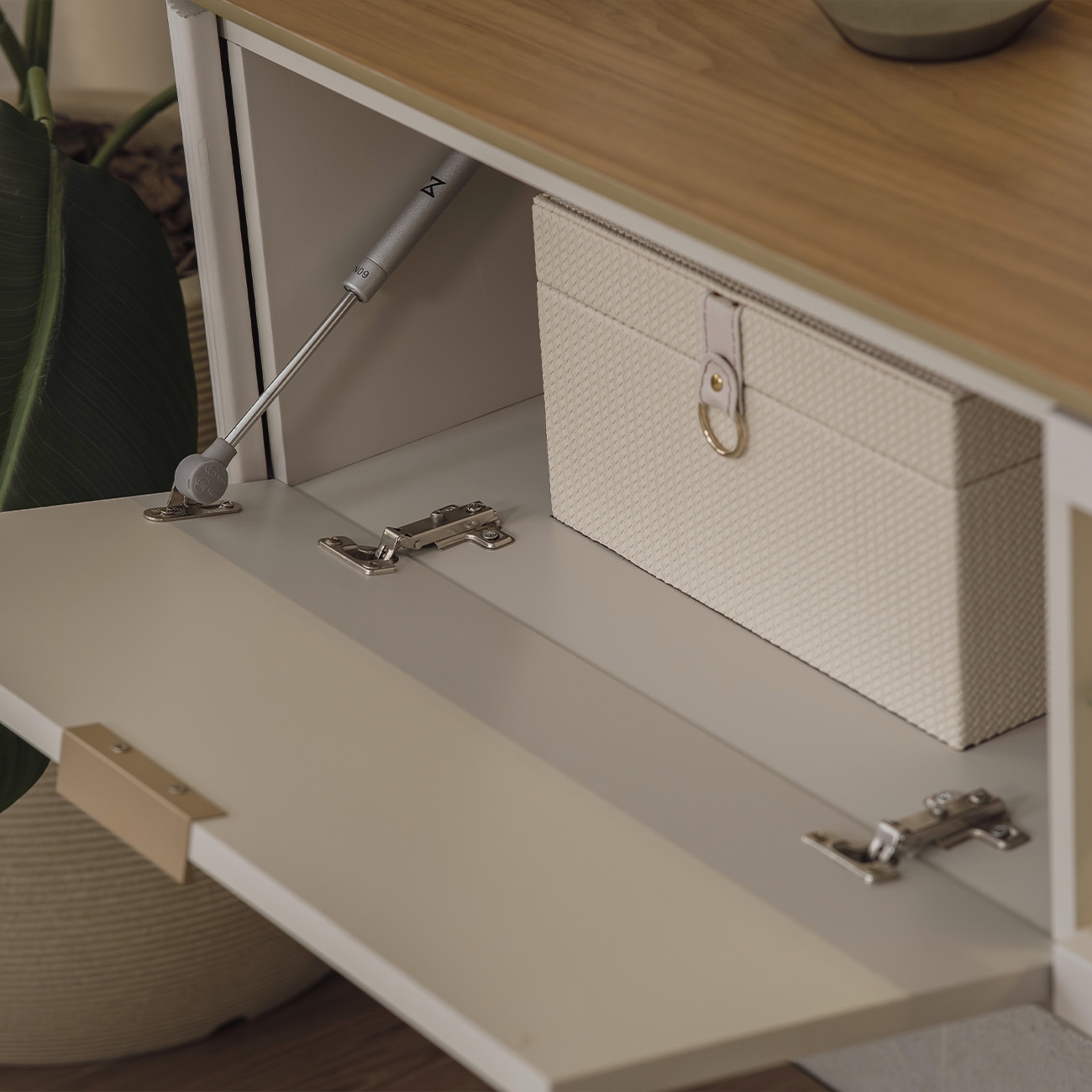 O tampo com bordas arredondadas e a prateleira superior de 25mm com acabamento chanfrado reforçam o cuidado nos detalhes. A prateleira de vidro reflete o LED e complementa o visual do Painel Home com leveza.