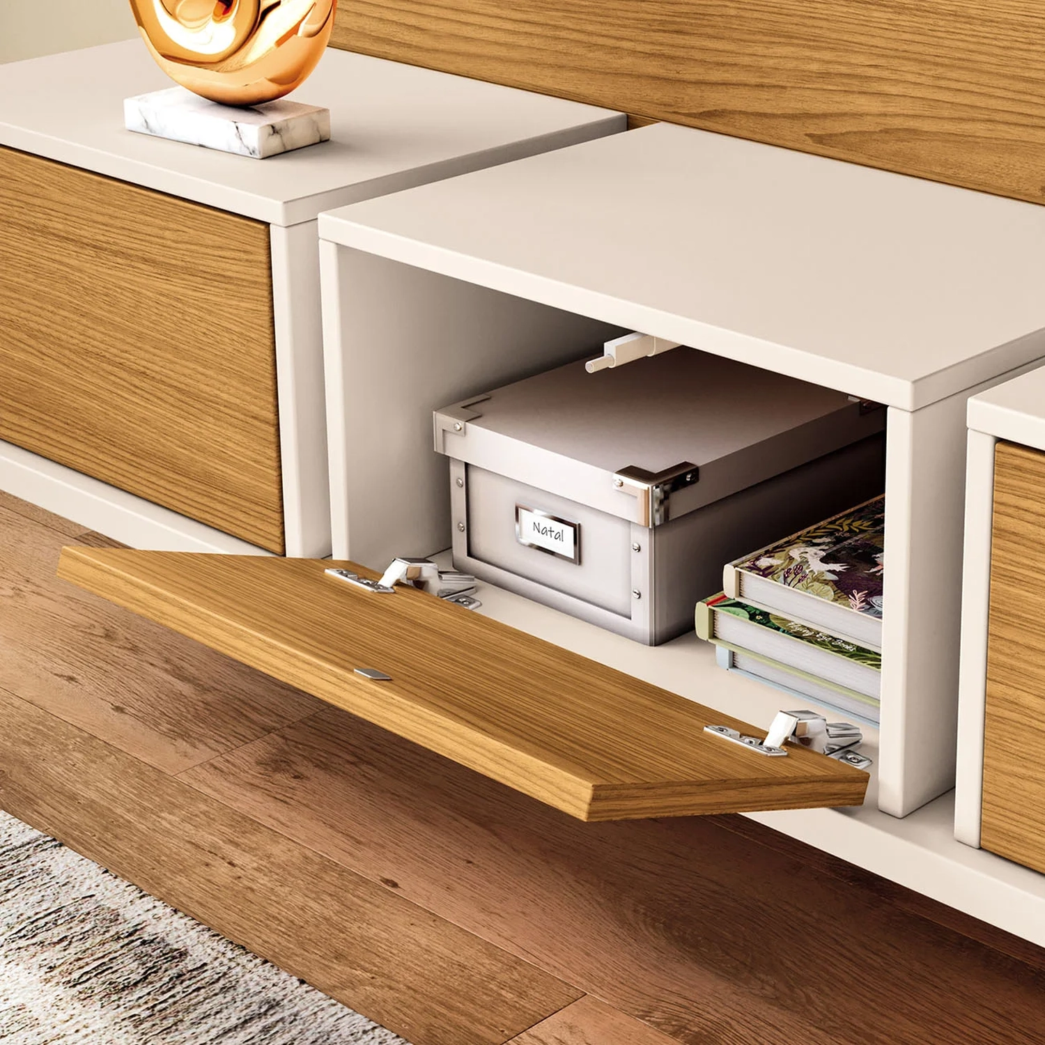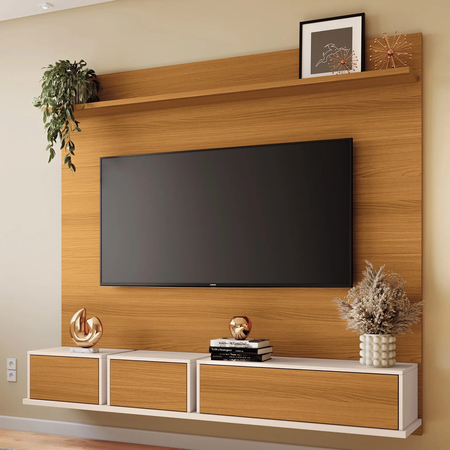 O Painel TV 70 Pol 180cm Bancada Suspensa Max Off/Cinamomo, da HB Móveis é composto por módulos e linhas retas, oferecendo uma estética contemporânea e clean.