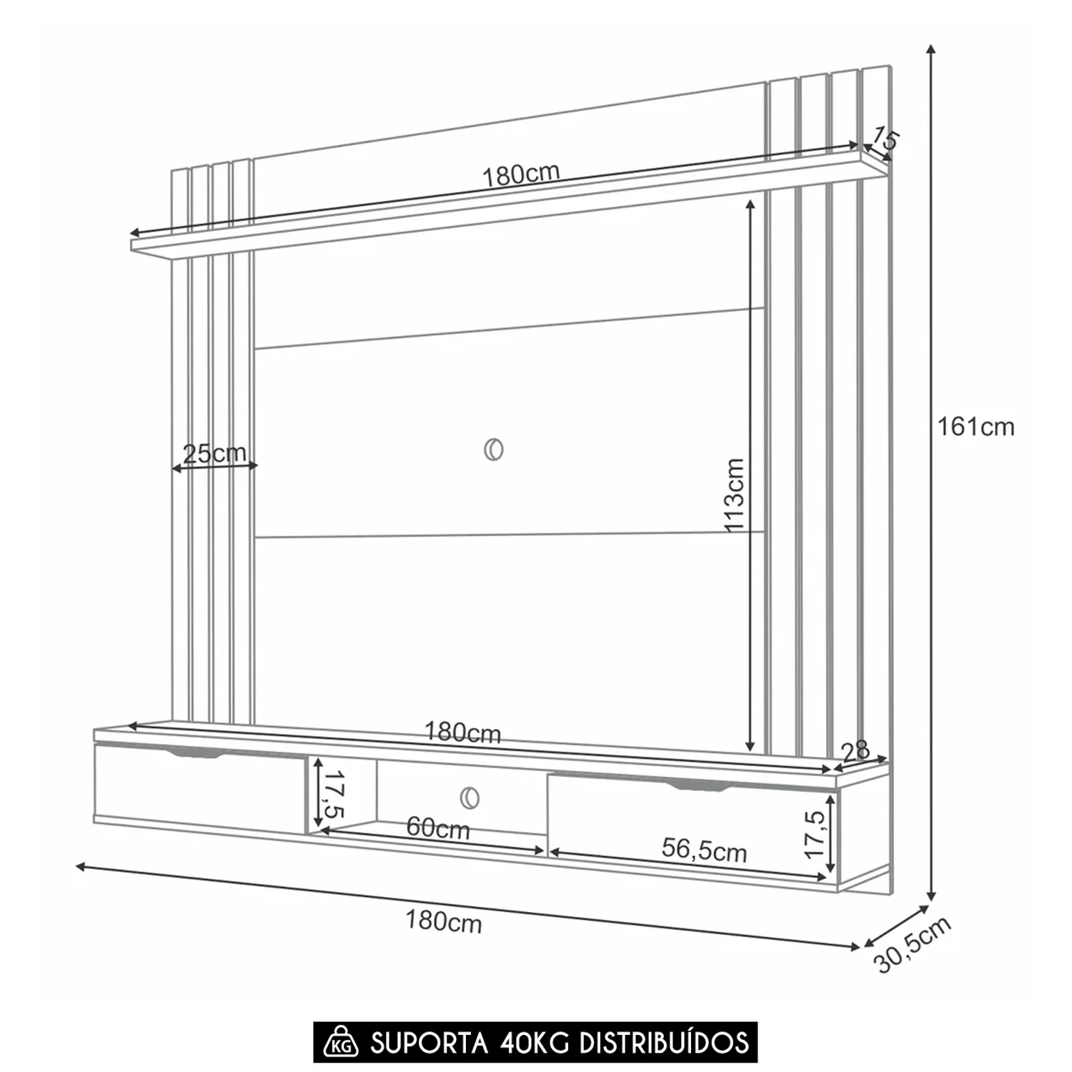 Ele é ideal para TV de até 70 polegadas fixada no painel, garantindo uma visão confortável e uma decoração moderna. Ele tem detalhes laterais ripado, que dão um toque de charme e elegância ao ambiente. Além disso, o painel conta com tampo e prateleira superior com espessura de 25mm, que oferecem resistência e 1 nicho para objetos decorativos ou eletrônicos. O Painel Suspenso também tem duas portas basculantes com dobradiças metálicas, que facilitam a abertura e o fechamento. As portas têm puxador em poliestireno com acabamento na cor champanhe, que combinam com o Design Moderno. O painel é produzido em MDP e MDF de 25mm e 15mm, que garantem durabilidade e qualidade ao produto.