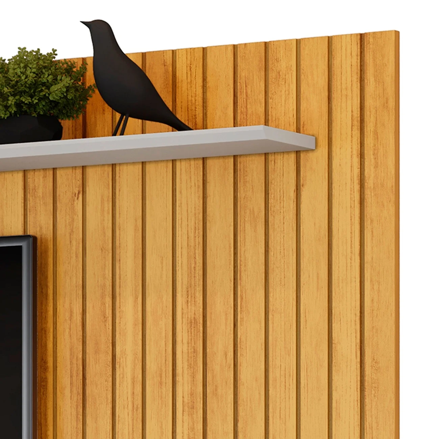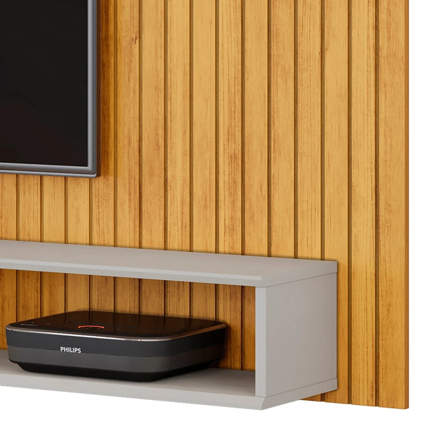 Com capacidade para suportar TVs de até 70 polegadas, este Painel permite que você escolha a TV ideal, garantindo uma experiência de entretenimento completa e sem preocupações. Sua estrutura é fabricada com peças de MDP/MDF de 12mm/15mm e acabamento em pintura UV, proporcionando alta resistência e durabilidade. A bancada suspensa com porta deslizante oferece nichos para armazenar seus itens e acomodar eletrônicos de forma harmoniosa. Conta ainda com uma prateleira superior que é ótima para exibir objetos decorativos, seu design contrasta elegantemente com os frisos do Painel Ripado. Também dispõe de passa-fios para facilitar a organização e ocultar os cabos, preservando uma estética clean em seu ambiente.