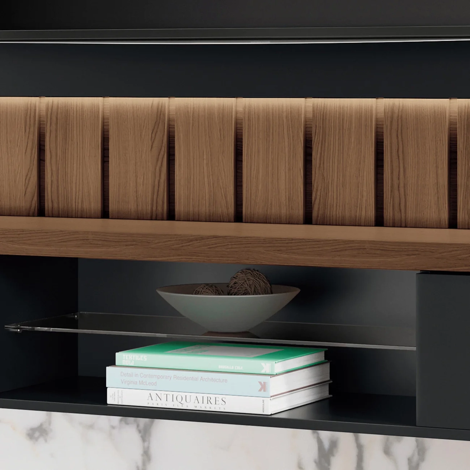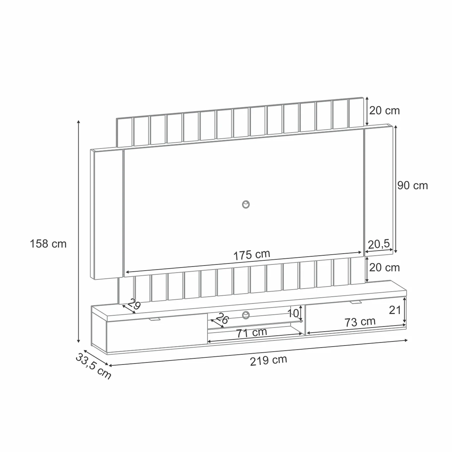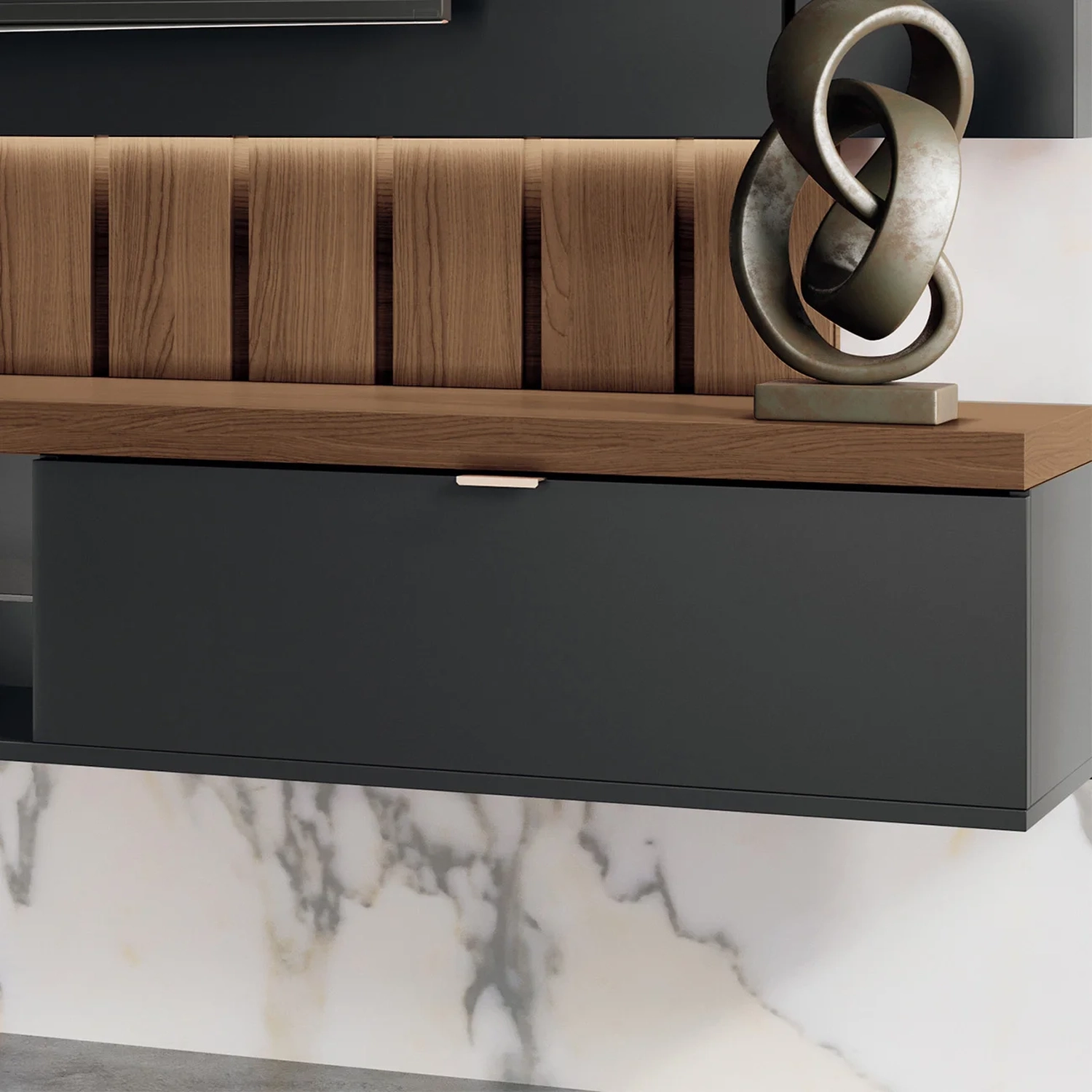 Produzido em MDF/MDP e com pintura UV, o Painel de TV possui 2 portas basculantes com puxadores na cor champanhe, que oferecem espaço para guardar objetos e acessórios. Além disso, ele conta com uma prateleira de vidro que pode ser usada para expor itens decorativos ou aparelhos eletrônicos. O detalhe em madeira ripada na parte superior do painel confere um toque de sofisticação e elegância ao ambiente. O Painel Suspenso suporta TV de até 70 polegadas e possui iluminação em LED, que cria um efeito aconchegante e charmoso. Ele é ideal para quem quer aproveitar melhor o espaço da sala e valorizar o seu estilo.