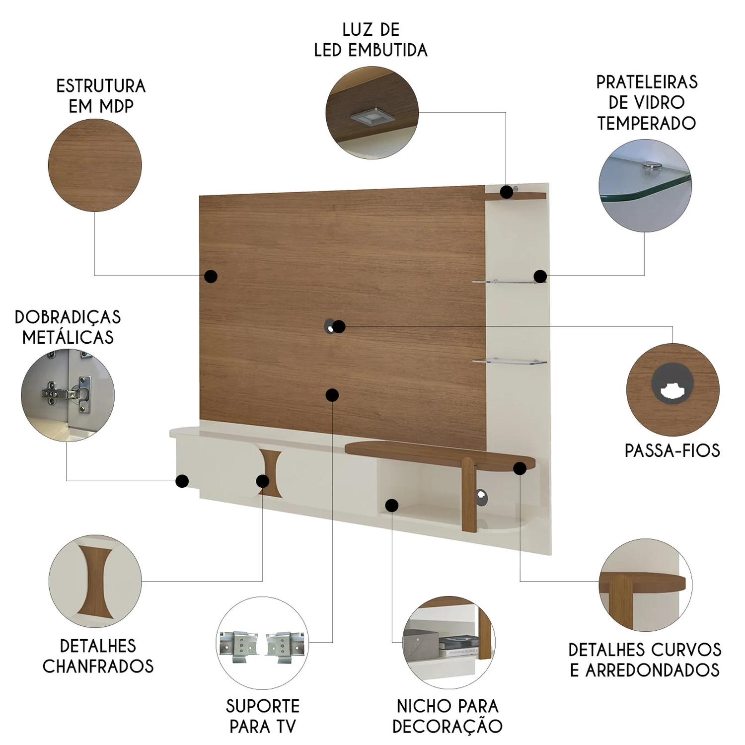 O design deste Painel Para Tv se destaca pelas formas curvas, criando um visual orgânico e harmonioso. Essa estética suave combina perfeitamente com ambientes modernos.