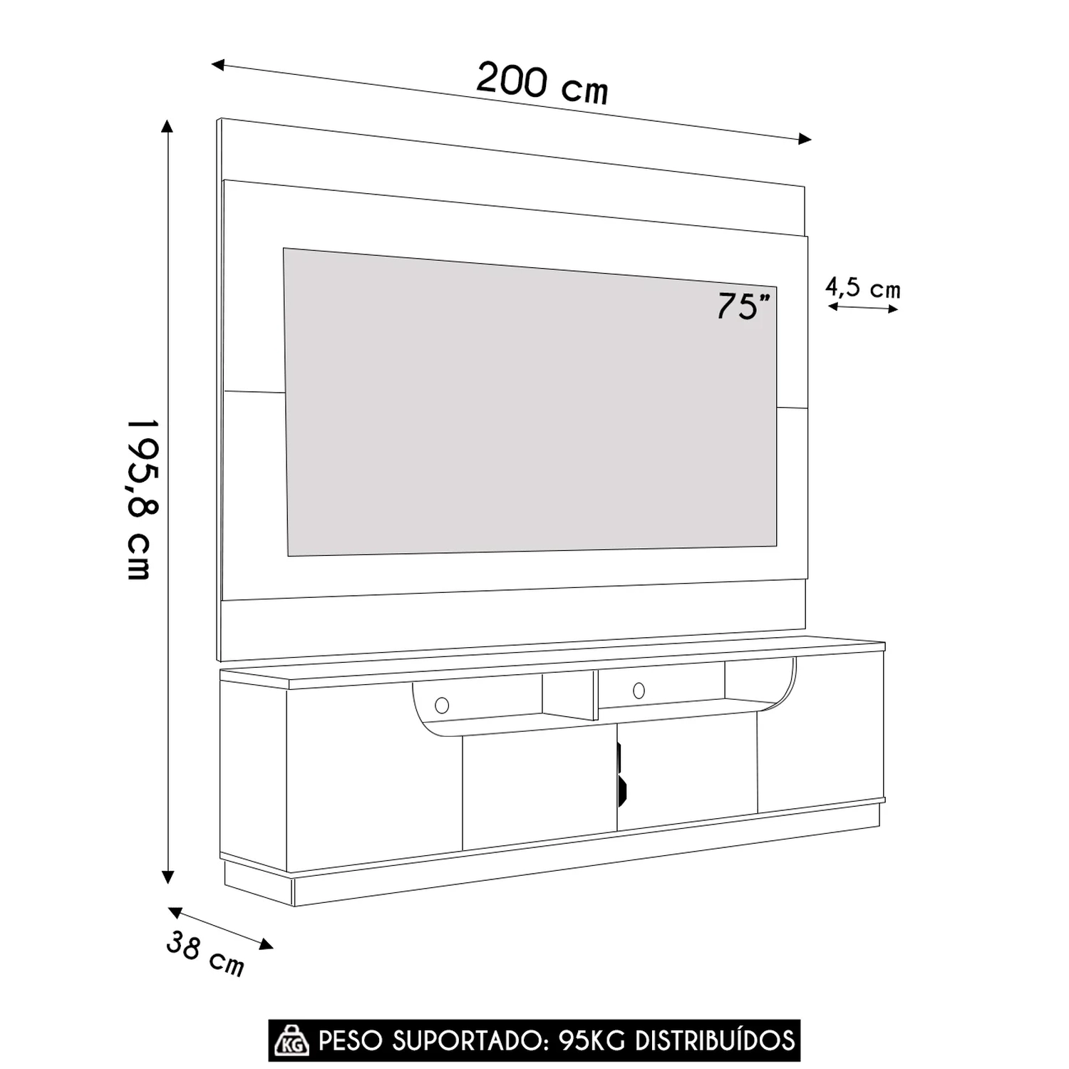 Produzido em MDP de 15 e 25mm com acabamento em pintura UV e fitas de borda em papel, o conjunto é resistente, durável e fácil de limpar. As dobradiças metálicas proporcionam uma abertura suave e silenciosa das portas. Compatíveis com TVs de até 75 polegadas, o Painel Suspenso e o Rack foram pensados para tornar seus momentos de descanso e entretenimento ainda mais agradáveis.