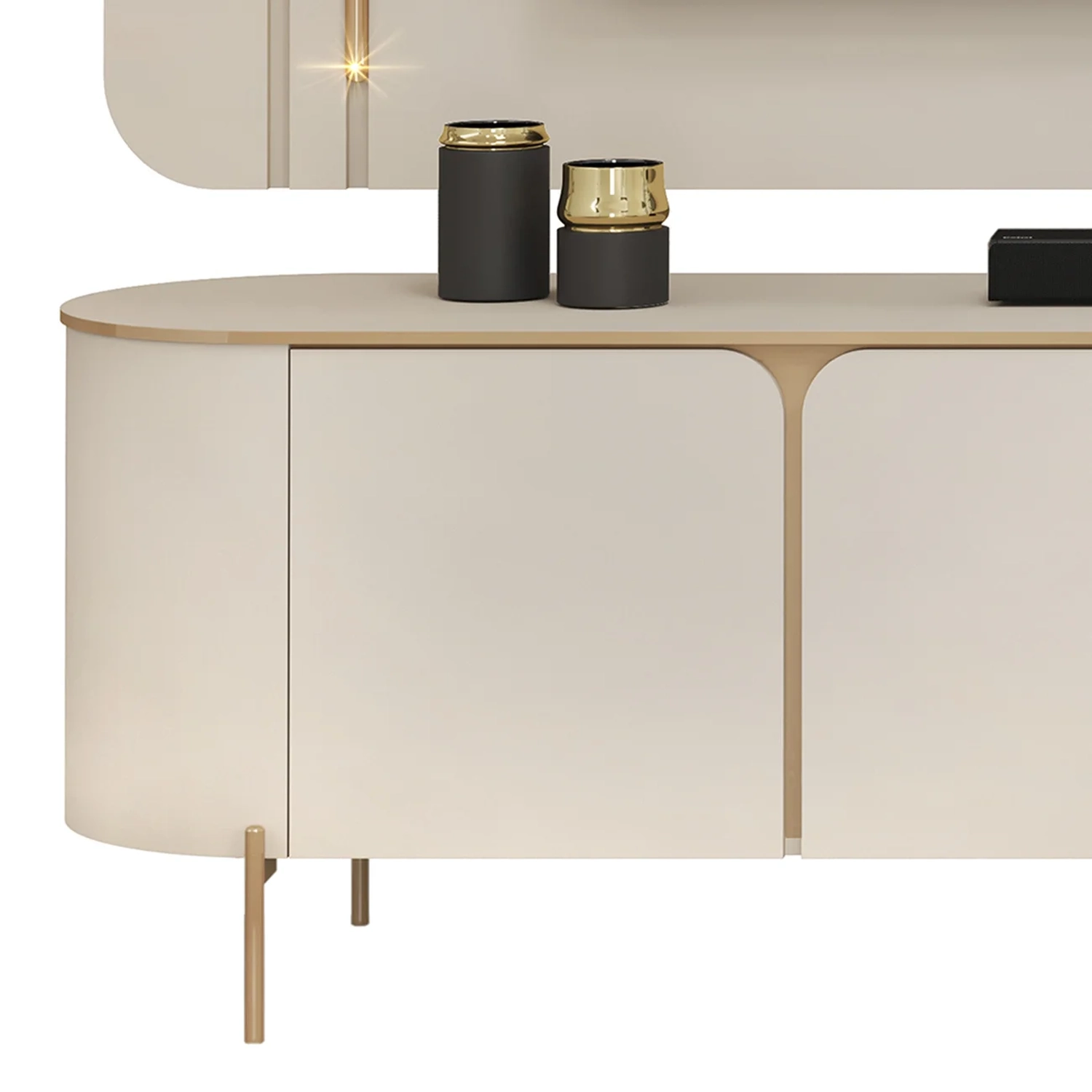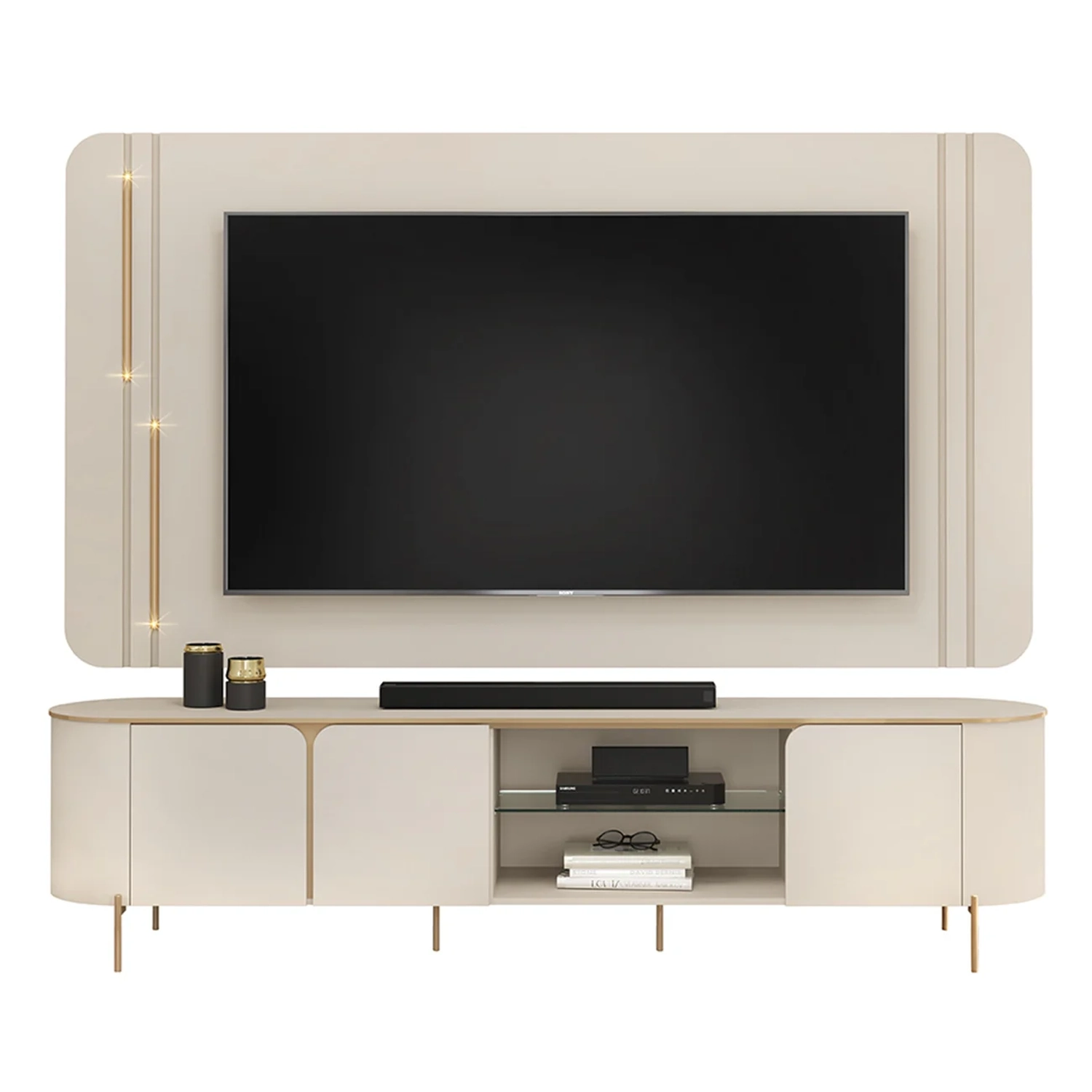Ideal para TVs de até 75 polegadas, ele reúne elegância, praticidade e qualidade em um design encantador. O Painel Para TV se destaca com cantos arredondados, complementadas por tubos metálicos dourados com iluminação LED intercalada, criando um efeito visual sofisticado. A instalação do LED pode ser ajustada para o lado que melhor se adapta ao seu ambiente, tornando o móvel ainda mais exclusivo. Já a bancada acompanha o visual refinado do Painel de TV, com tampo de bordas arredondadas e detalhes dourados que trazem modernidade ao espaço. Conta com três portas curvas, uma prateleira de vidro para organização elegante e pés metálicos dourados que garantem resistência e praticidade durante a limpeza. O passa-fios integrado facilita o manuseio dos cabos, mantendo o ambiente organizado. Produzidos 100% em MDF com madeira de reflorestamento e acabamento em pintura UV, o Painel e o Rack Bancada oferecem robustez, sustentabilidade e um design único, que alia charme e funcionalidade para deixar seu lar mais acolhedor e sofisticado.