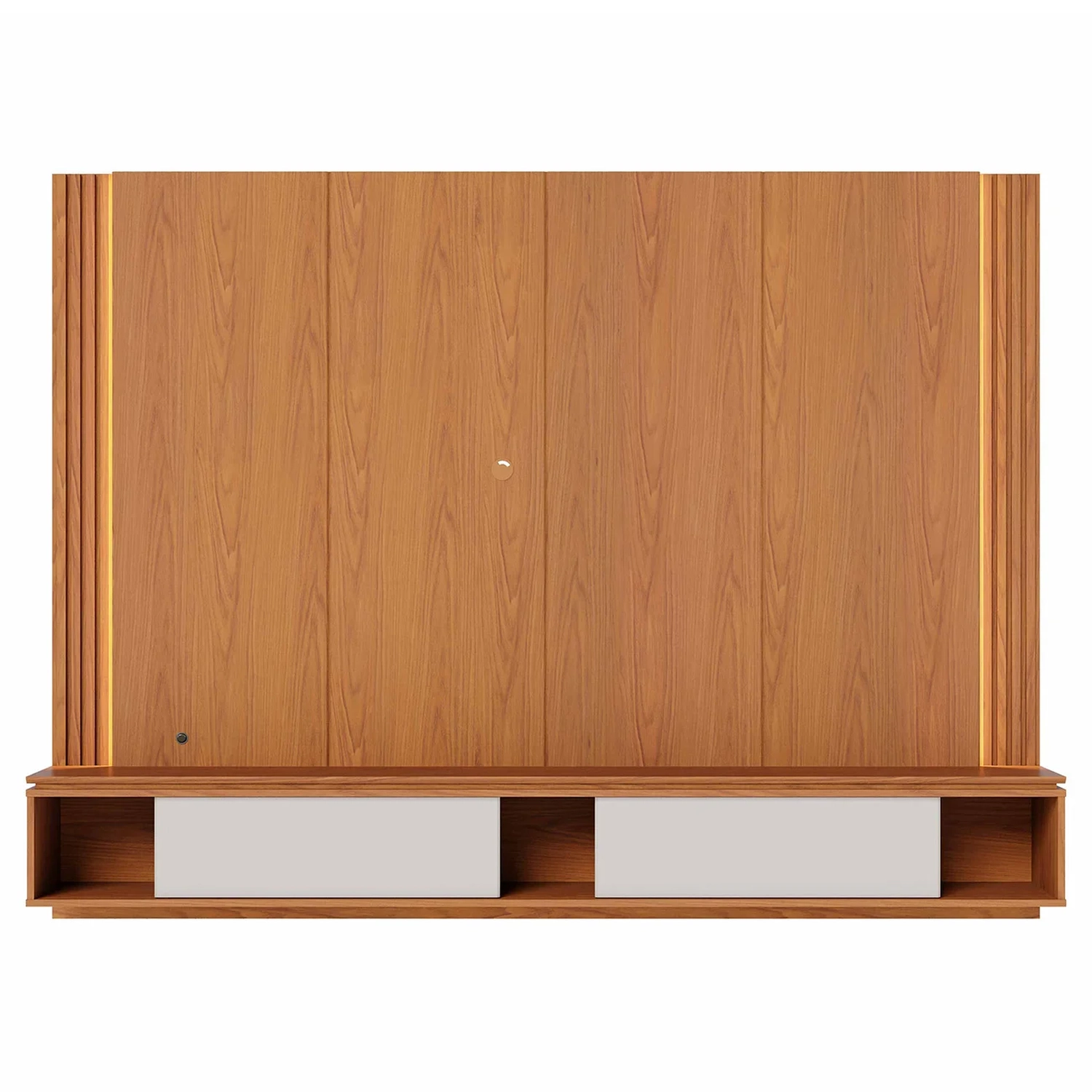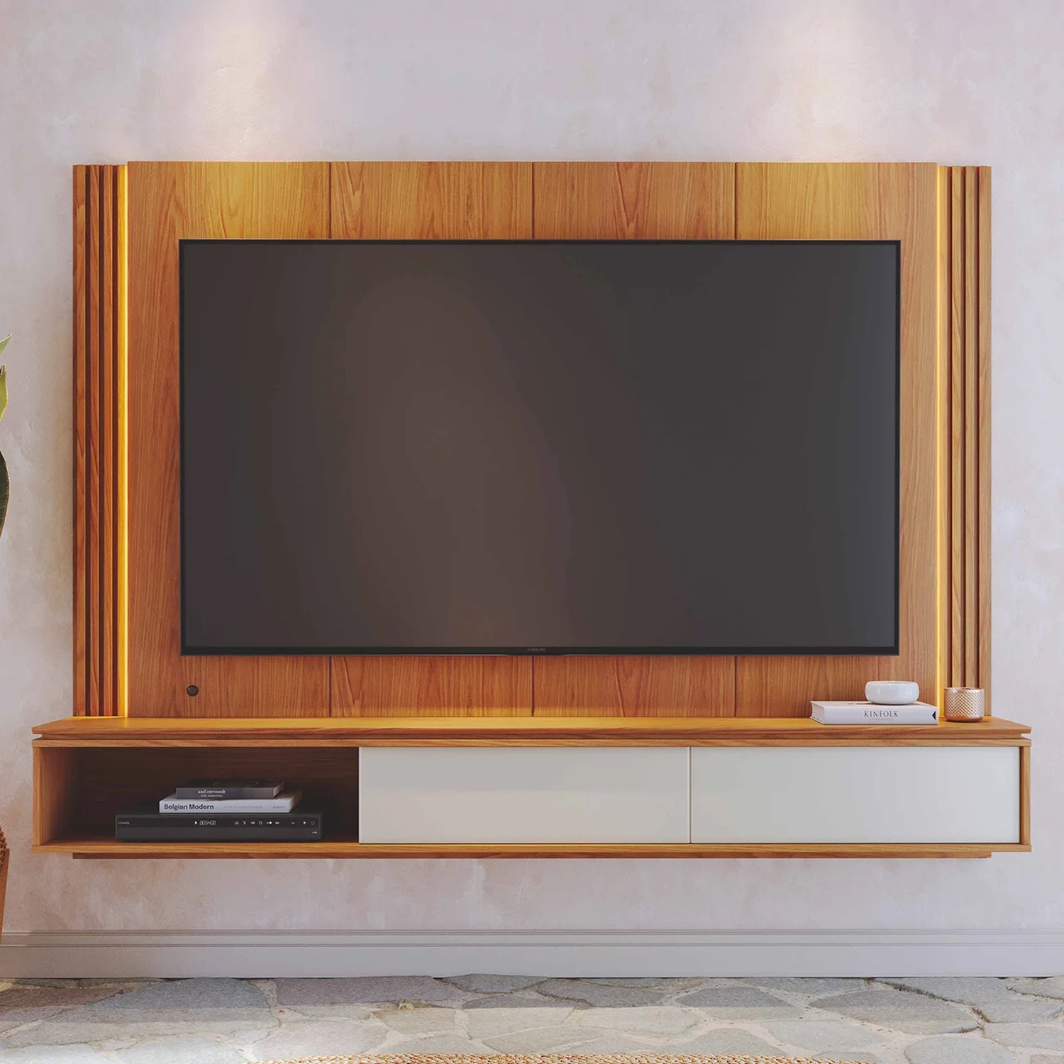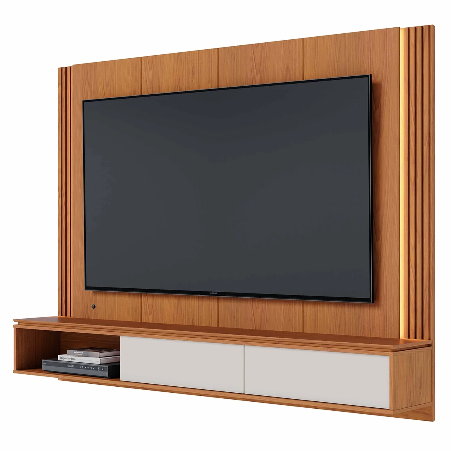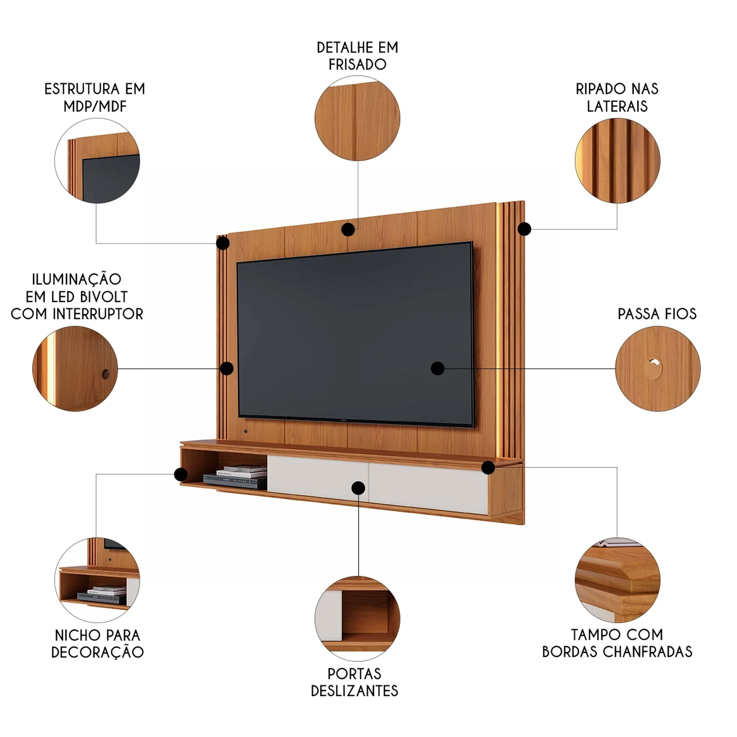 É fabricado em MDP e MDF com acabamento em pintura UV e fitas de borda em papel, materiais de alta qualidade que garantem máxima resistência no uso diário. Projetado para acomodar TVs de até 75 polegadas, o Painel é suspenso, o que otimiza o espaço, deixando a área de circulação livre e proporcionando uma aparência clean e visualmente agradável.