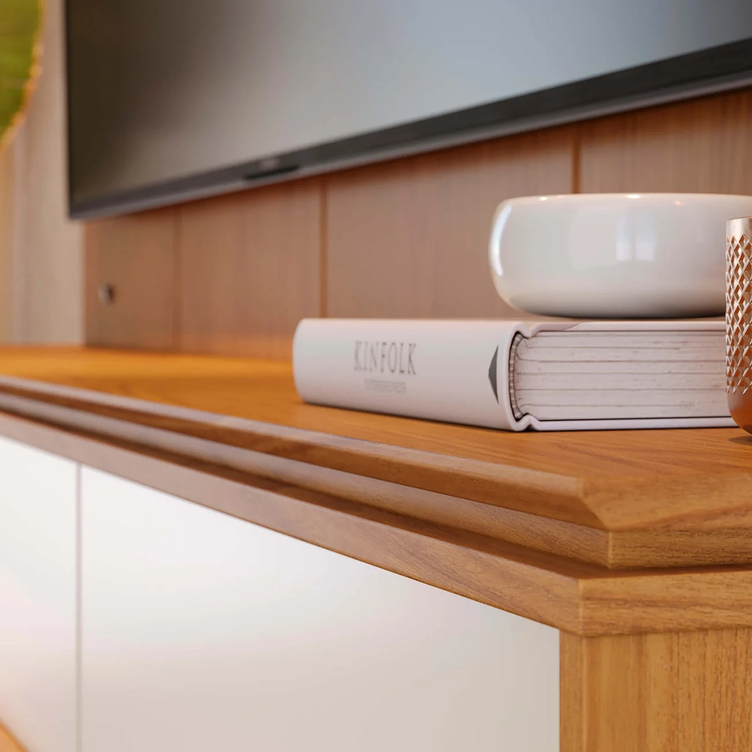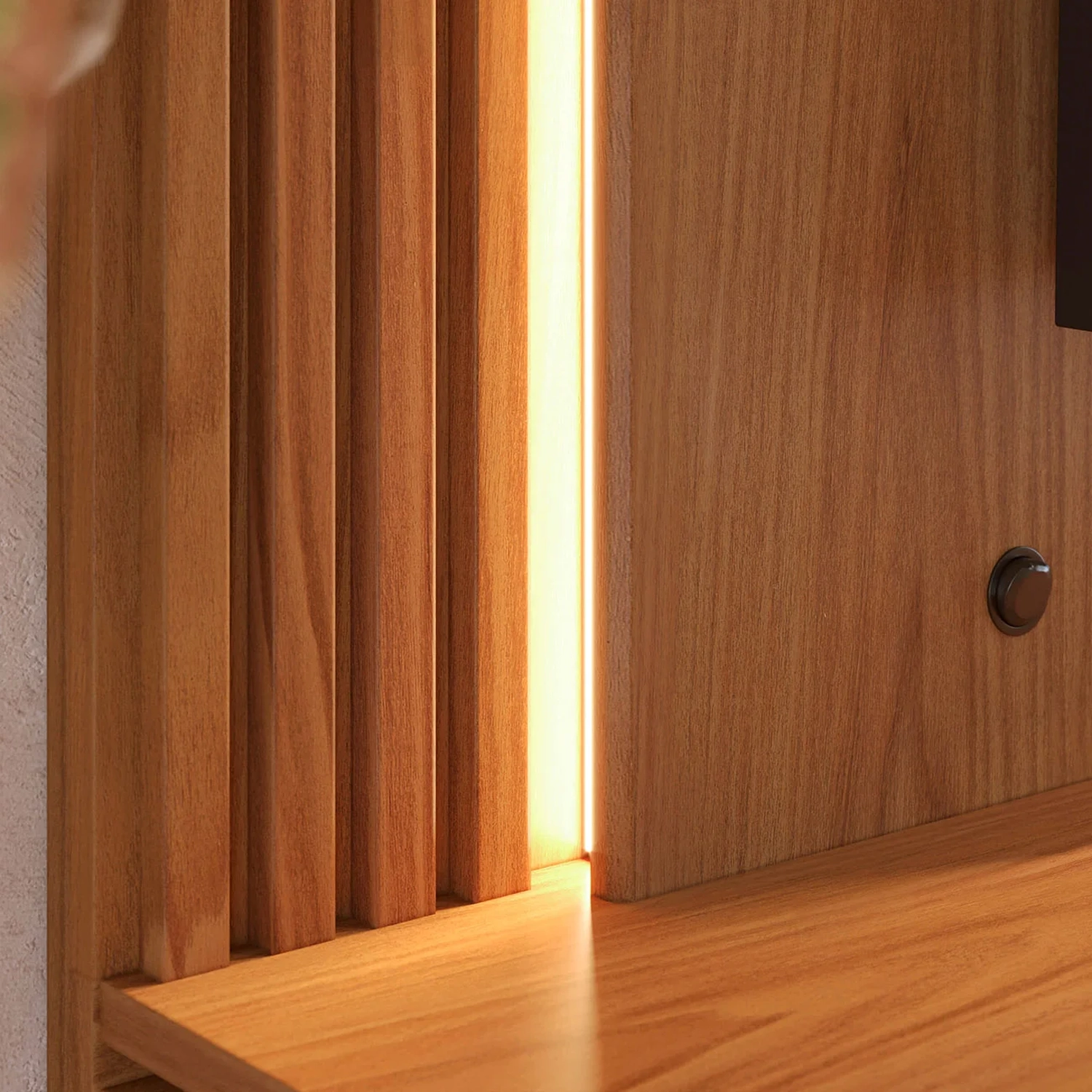 - Painel com detalhes chanfrados e ripados decorativos.