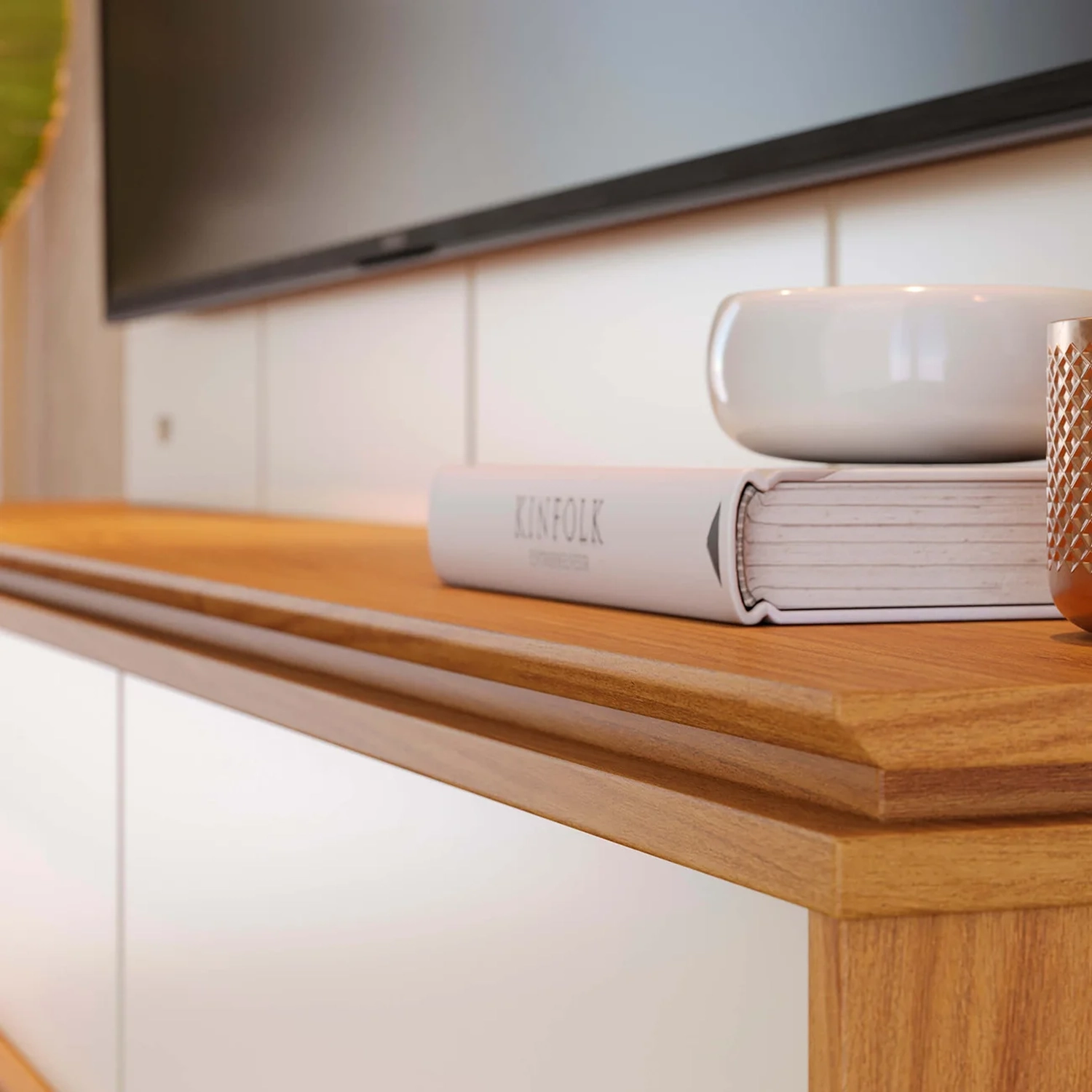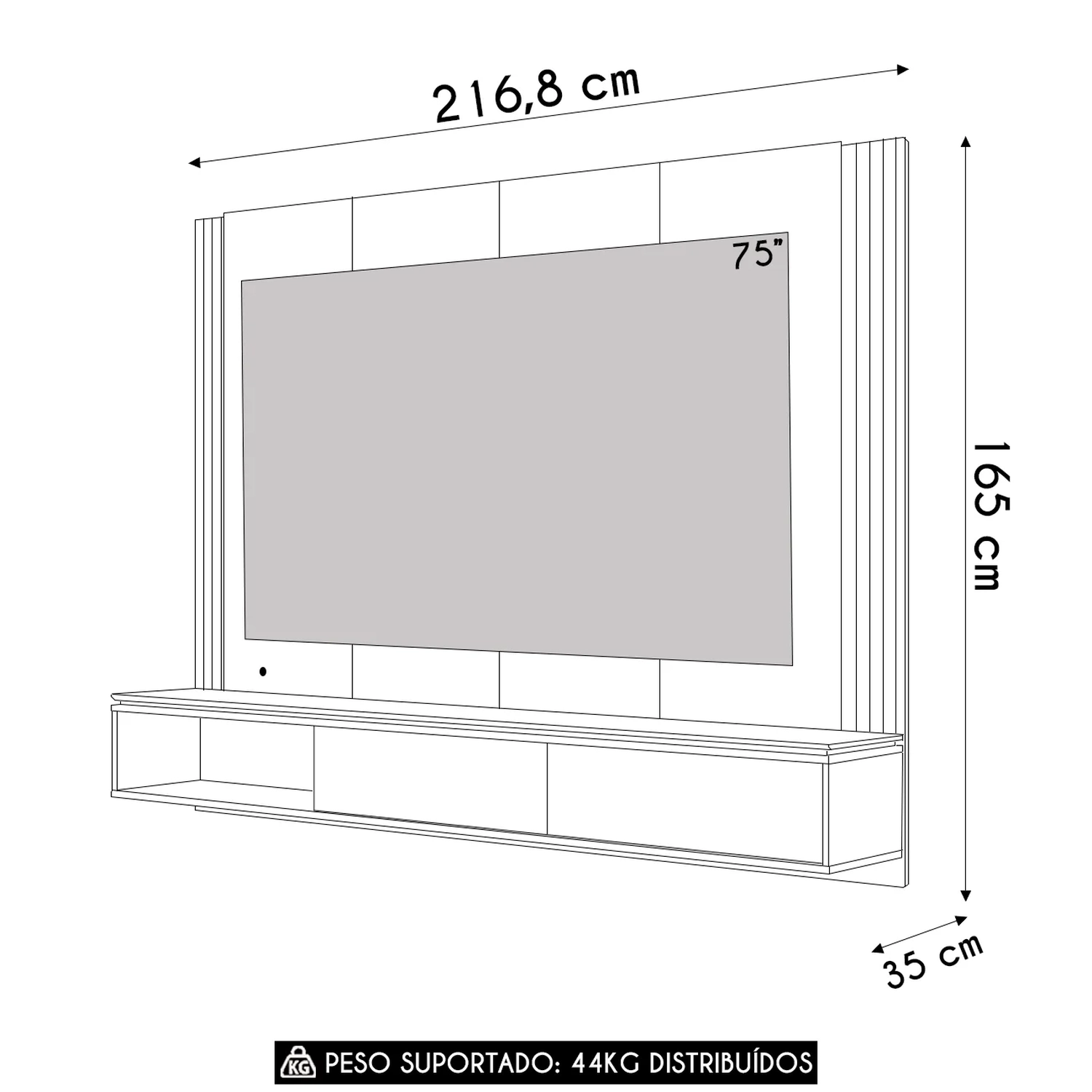É fabricado em MDP e MDF com acabamento em pintura UV e fitas de borda em papel, materiais de alta qualidade que garantem máxima resistência no uso diário. Projetado para acomodar TVs de até 75 polegadas, o Painel é suspenso, o que otimiza o espaço, deixando a área de circulação livre e proporcionando uma aparência clean e visualmente agradável.