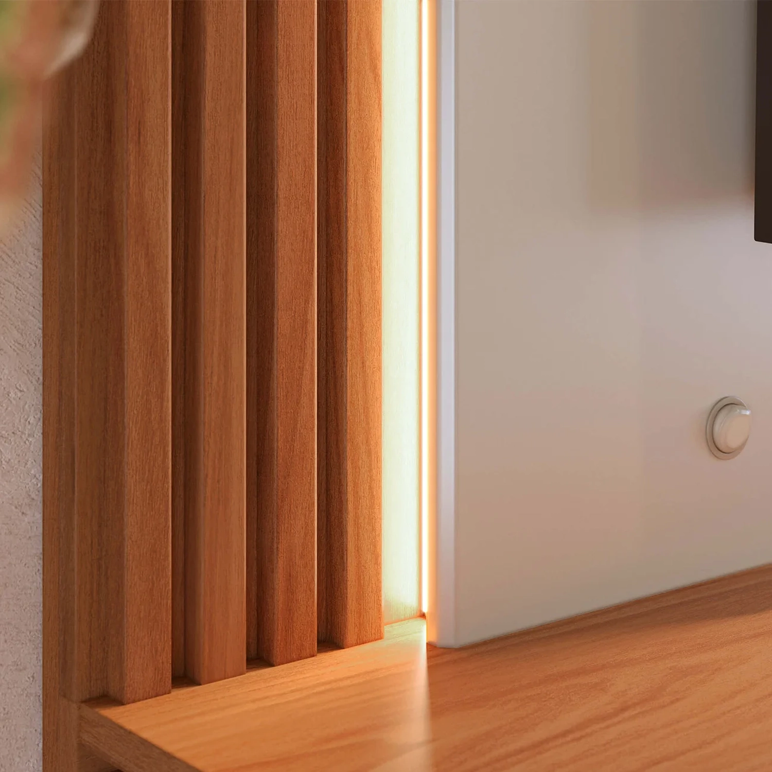 O Painel para TV apresenta traços chanfrados na madeira e detalhes ripados nas extremidades, que agregam um toque de elegância e delicadeza à peça. A iluminação em LED, presente em ambos os lados, realça a decoração do ambiente e conta com um interruptor de fácil acionamento. Além disso, é excelente para expor objetos decorativos, aparelhos eletrônicos, livros, porta-retratos e itens pessoais de forma moderna e eficiente.