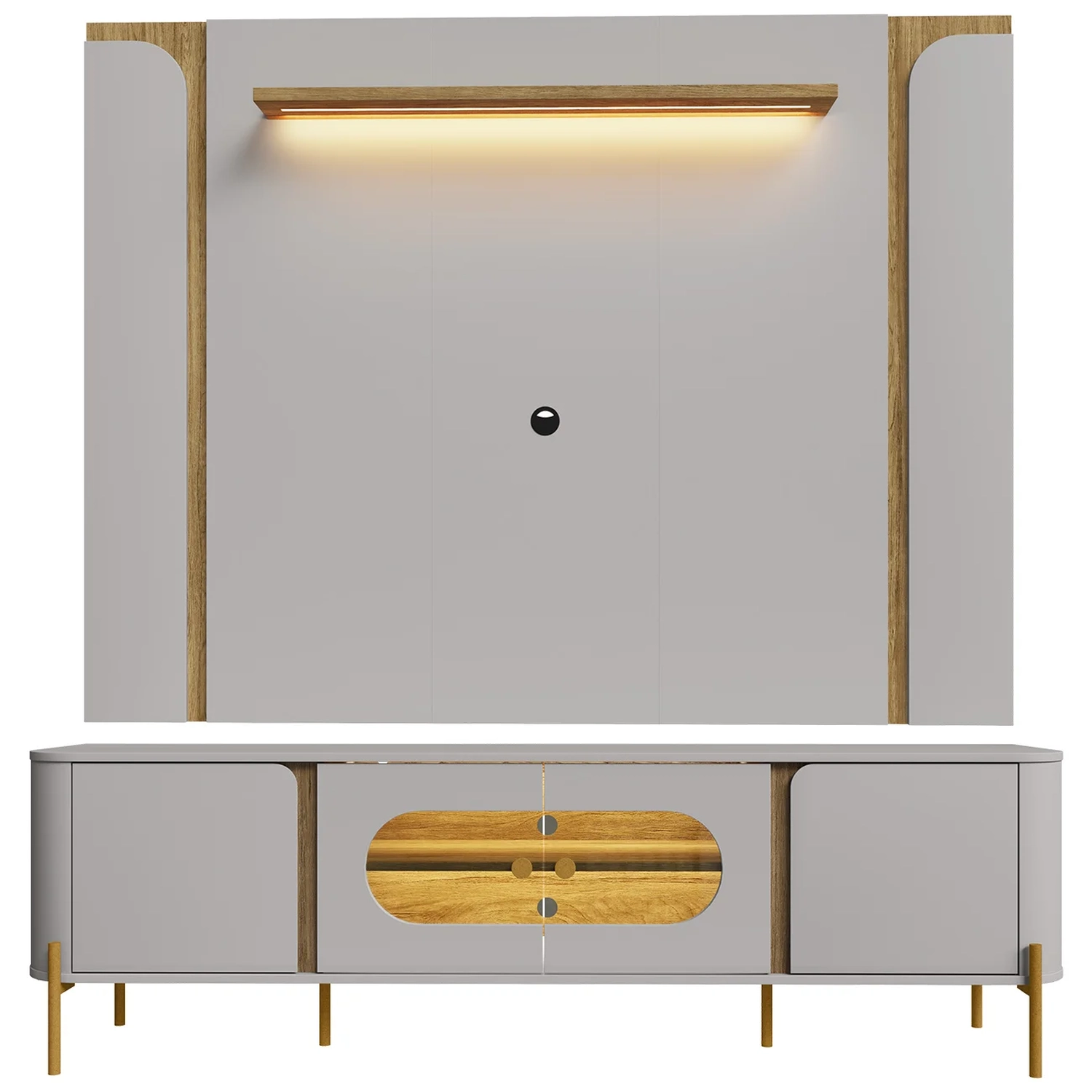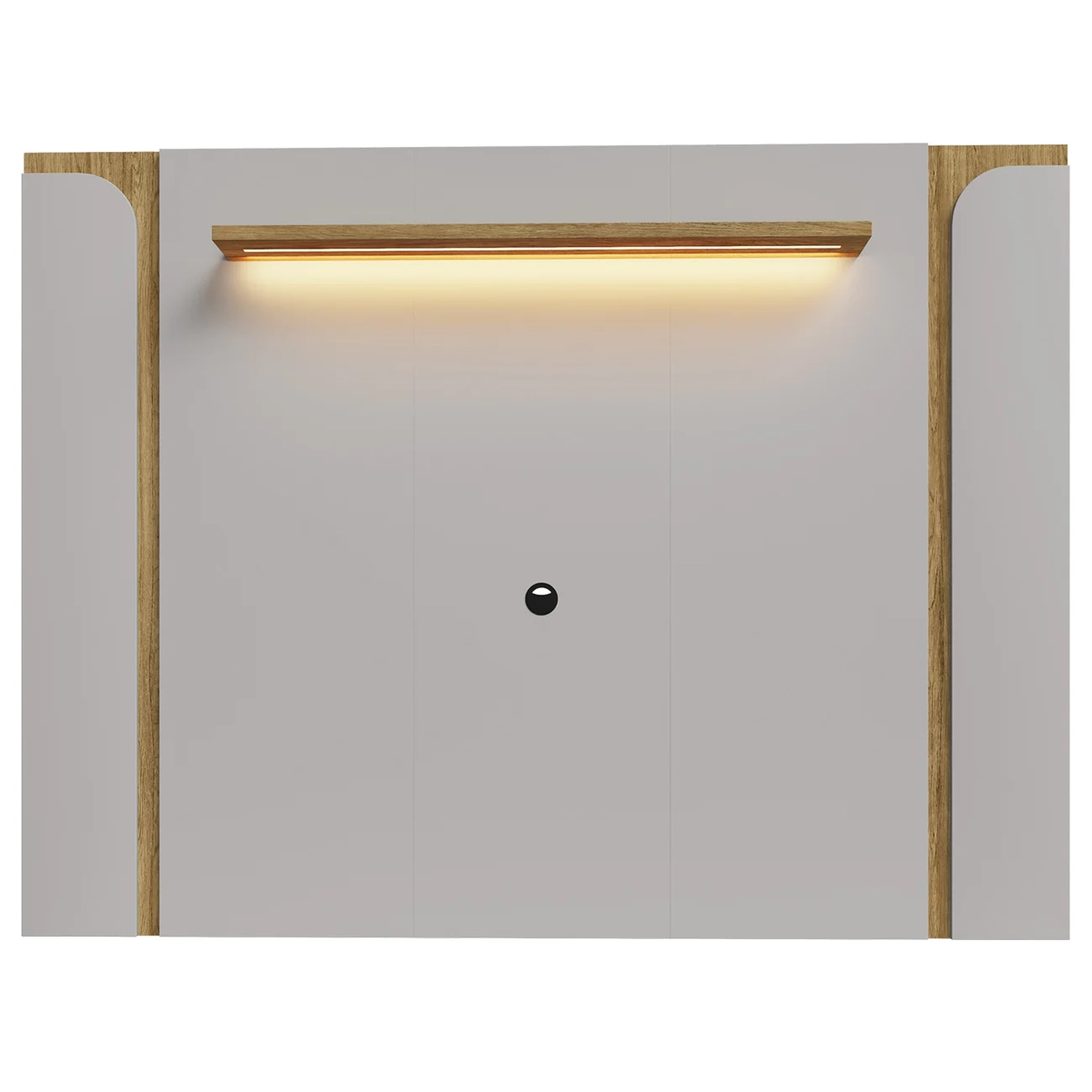Já o Painel possui uma prateleira robusta e acabamento de alta qualidade, conferindo sofisticação ao ambiente. Seus detalhes laterais curvos e design leve trazem charme e elegância ao espaço.