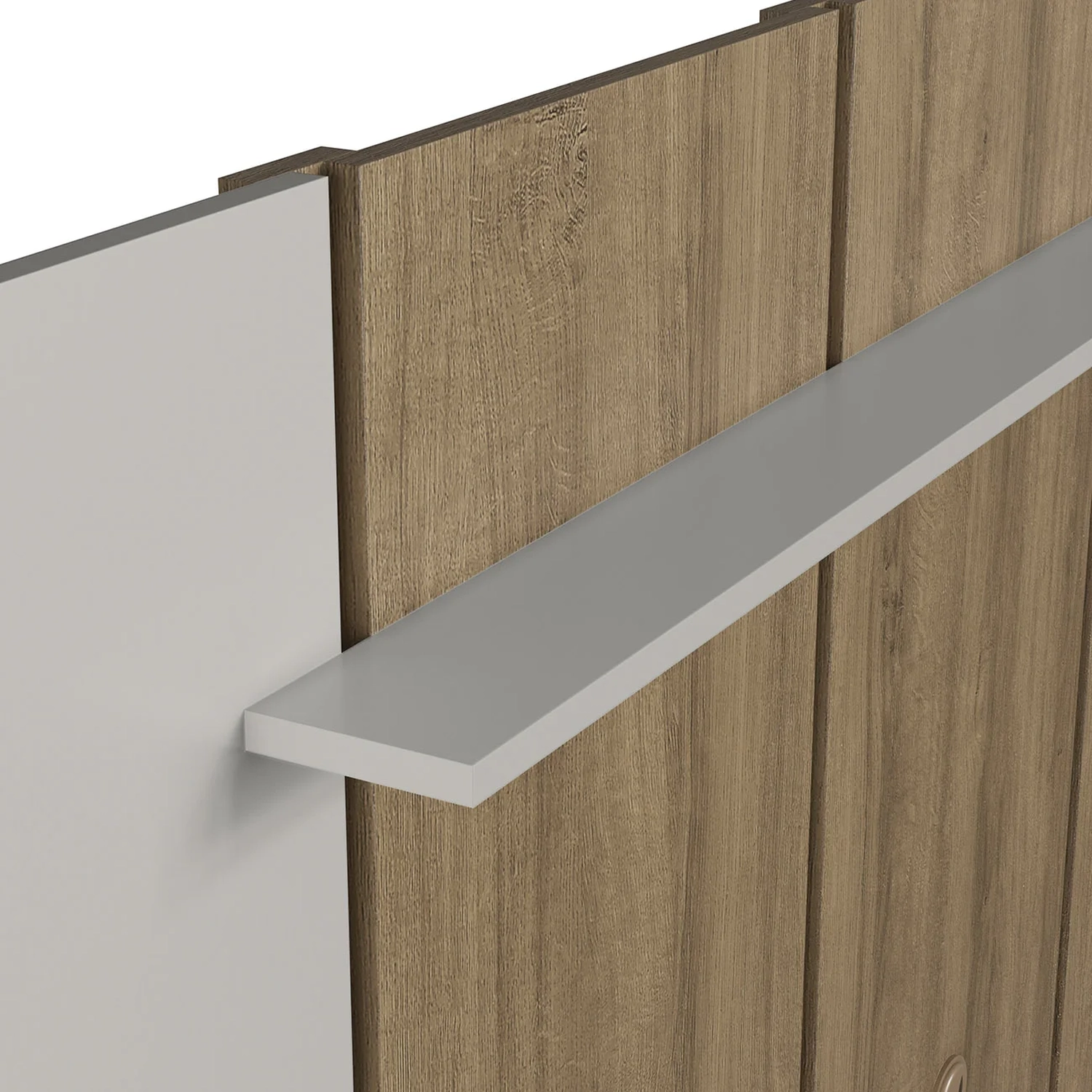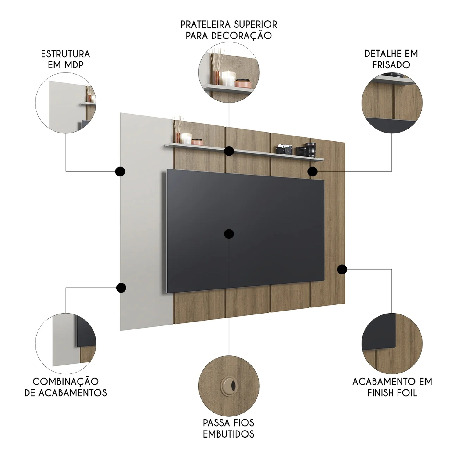 O painel conta com prateleira superior para acomodar objetos decorativos, além de passa fios, garantindo praticidade e uma aparência sempre organizada, perfeita para quem deseja unir beleza e funcionalidade.
