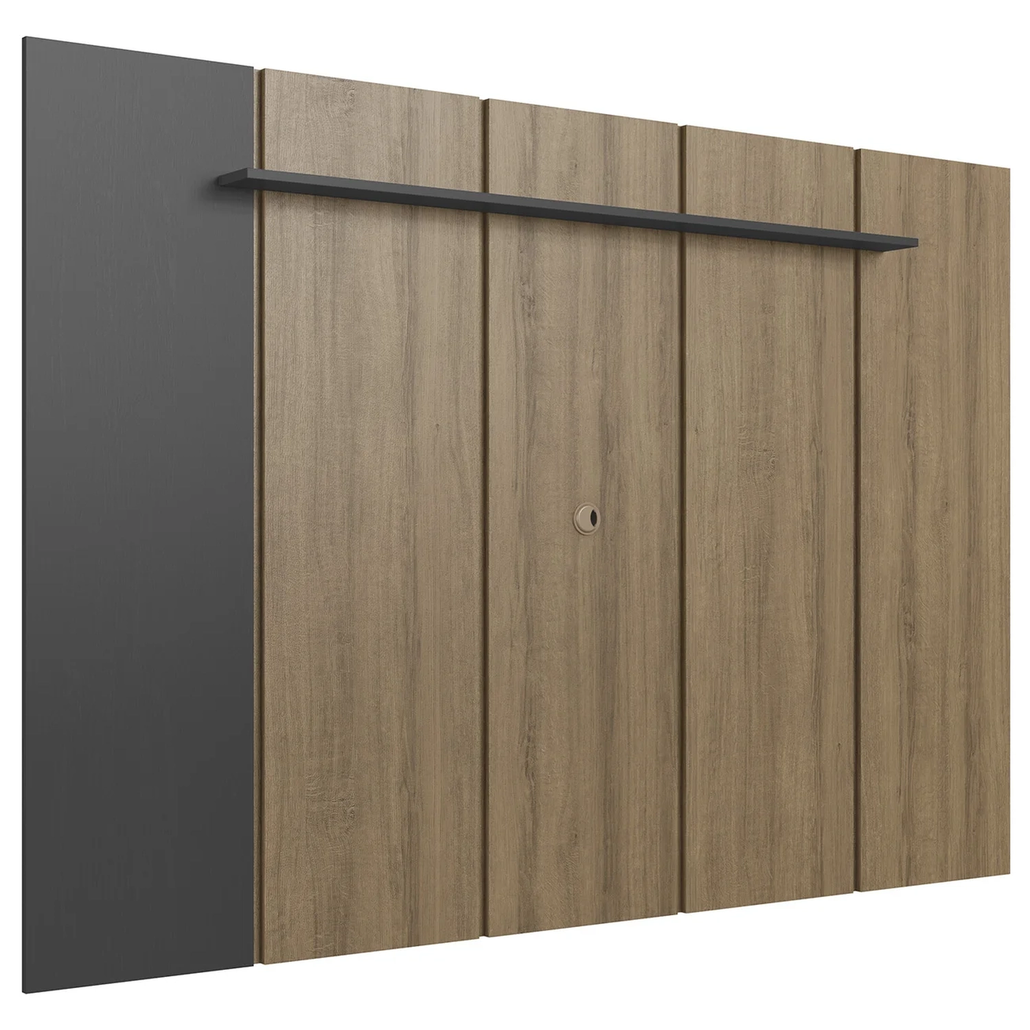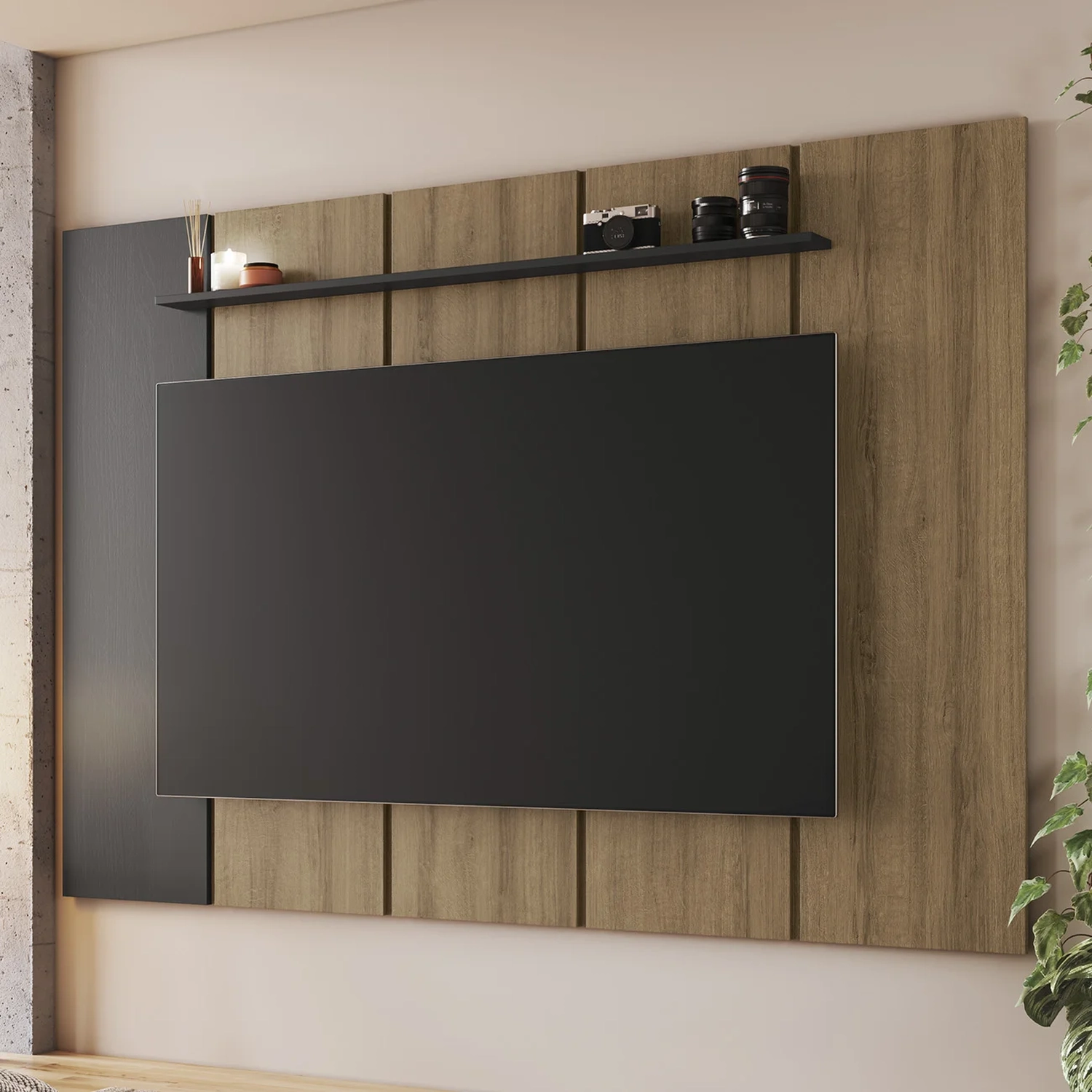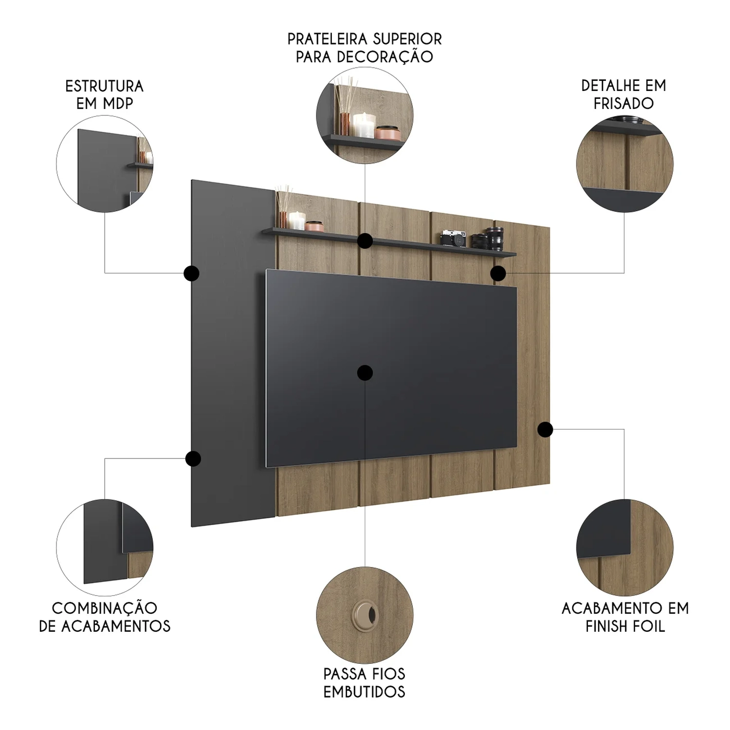 O painel conta com prateleira superior para acomodar objetos decorativos, além de passa fios, garantindo praticidade e uma aparência sempre organizada, perfeita para quem deseja unir beleza e funcionalidade.
