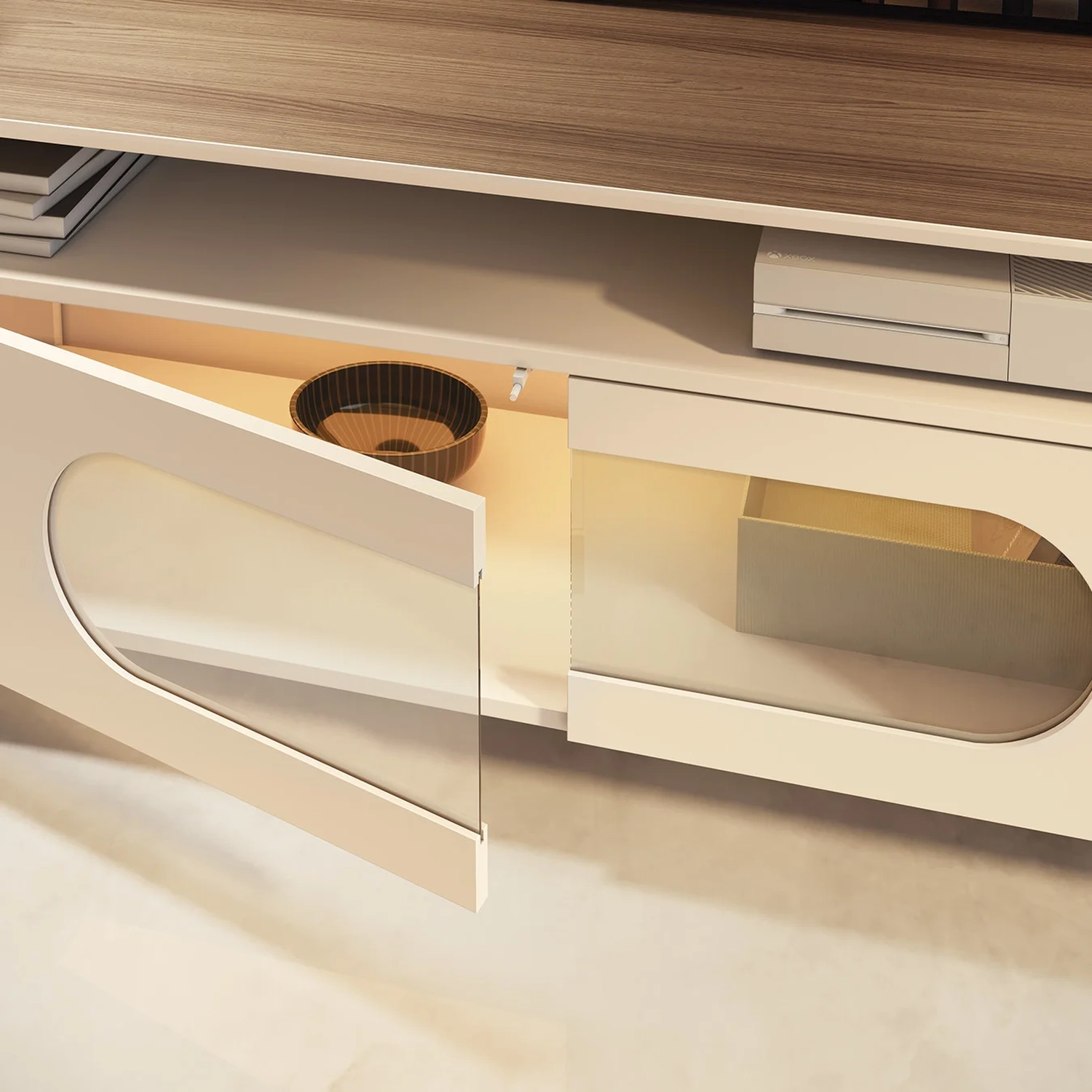 O painel possui bordas laterais arredondadas e iluminação LED embutida na parte superior, criando um efeito de luz indireta que valoriza o ambiente com suavidade e charme. Sua estrutura suporta televisores de até 85 polegadas com segurança e estilo.