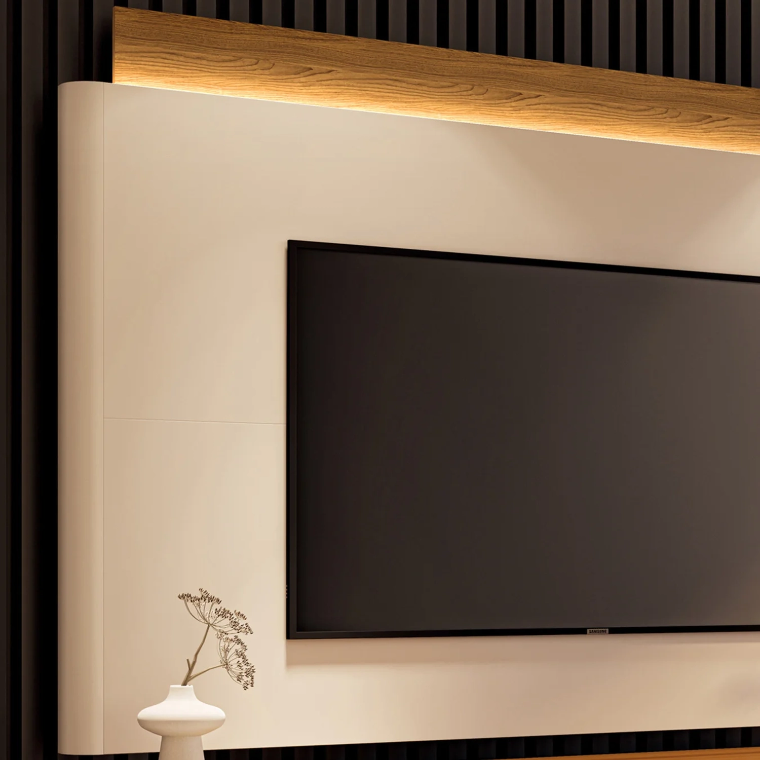 O painel possui bordas laterais arredondadas e iluminação LED embutida na parte superior, criando um efeito de luz indireta que valoriza o ambiente com suavidade e charme. Sua estrutura suporta televisores de até 85 polegadas com segurança e estilo.