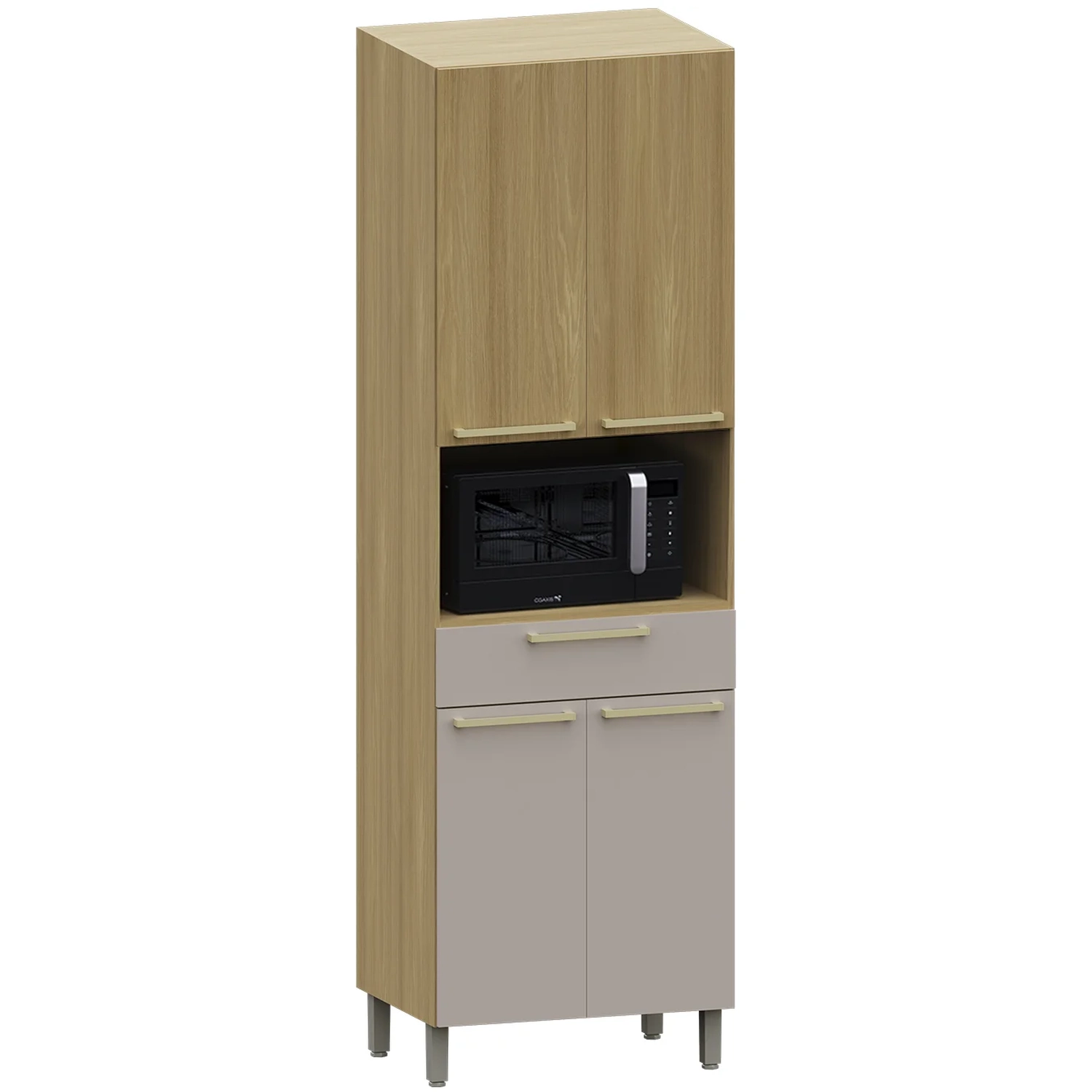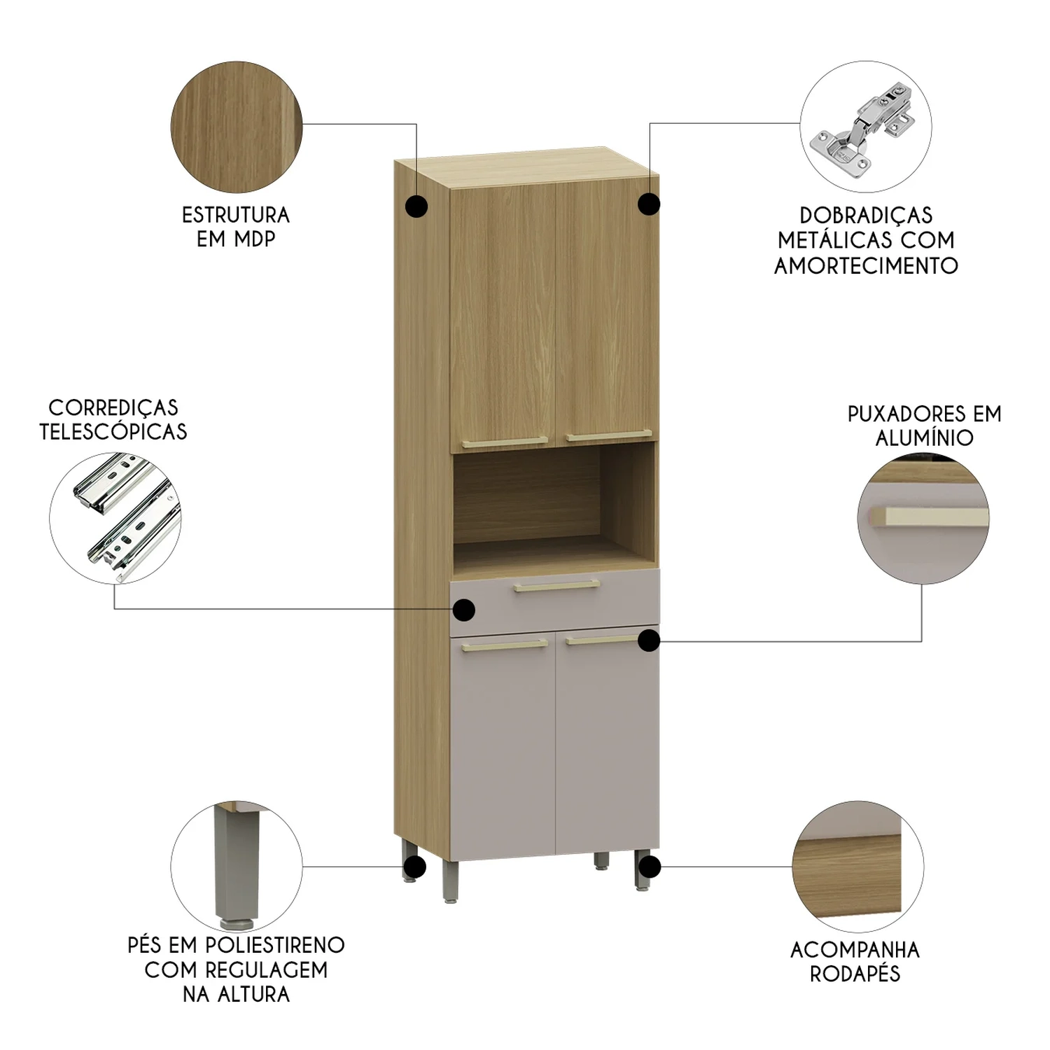 Além disso, o Paneleiro conta com uma gaveta com corrediças telescópicas, que oferecem um deslizar suave e sem esforço. O nicho para micro-ondas é espaçoso e ideal para quem precisa de um lugar especial para o eletrodoméstico.