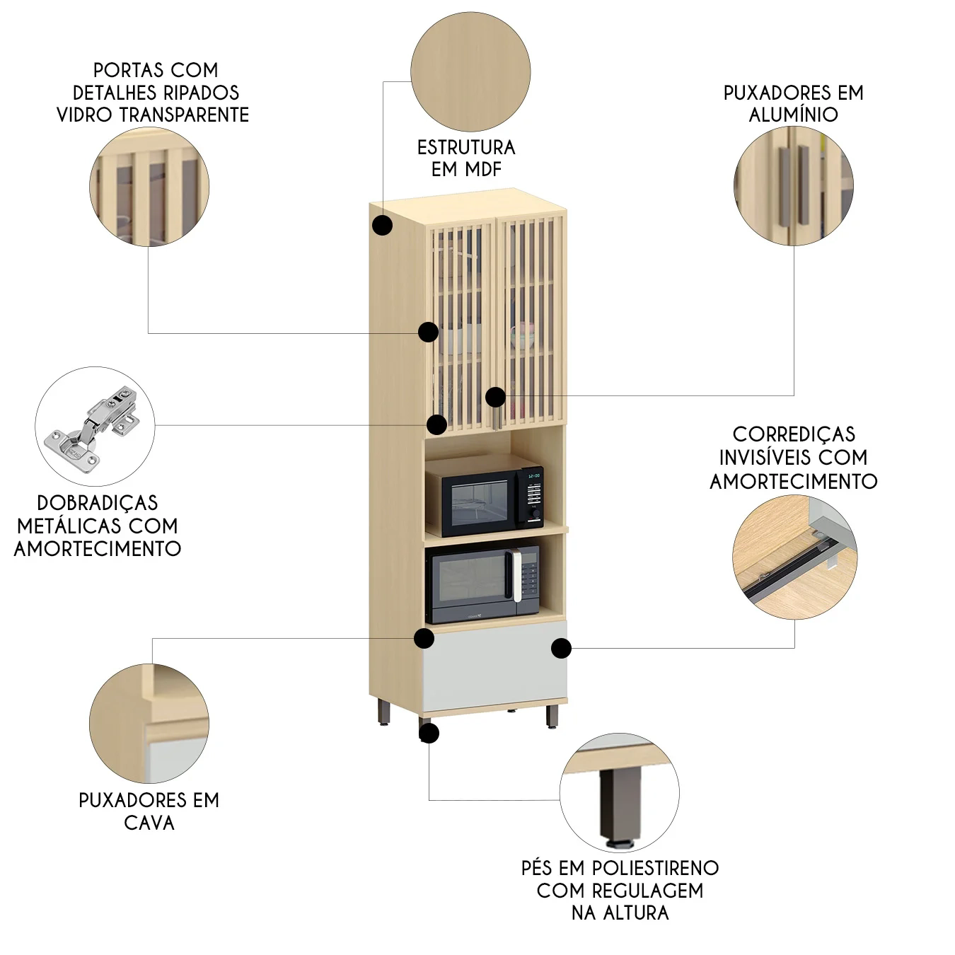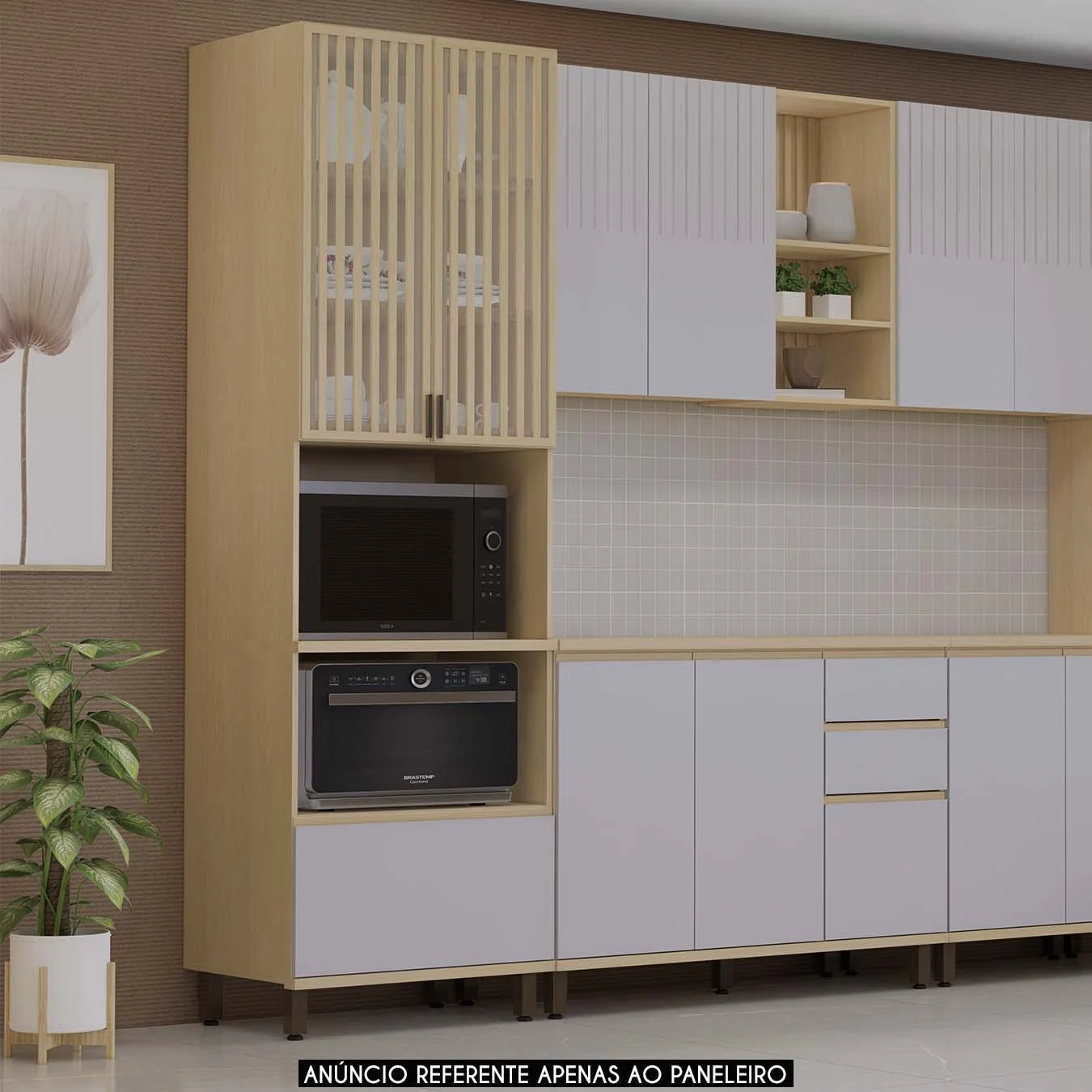 As portas com dobradiças metálicas garantem um fechamento suave e silencioso. O detalhe ripado e com vidros nas portas traz um toque de elegância, deixando o Paneleiro ainda mais encantador.