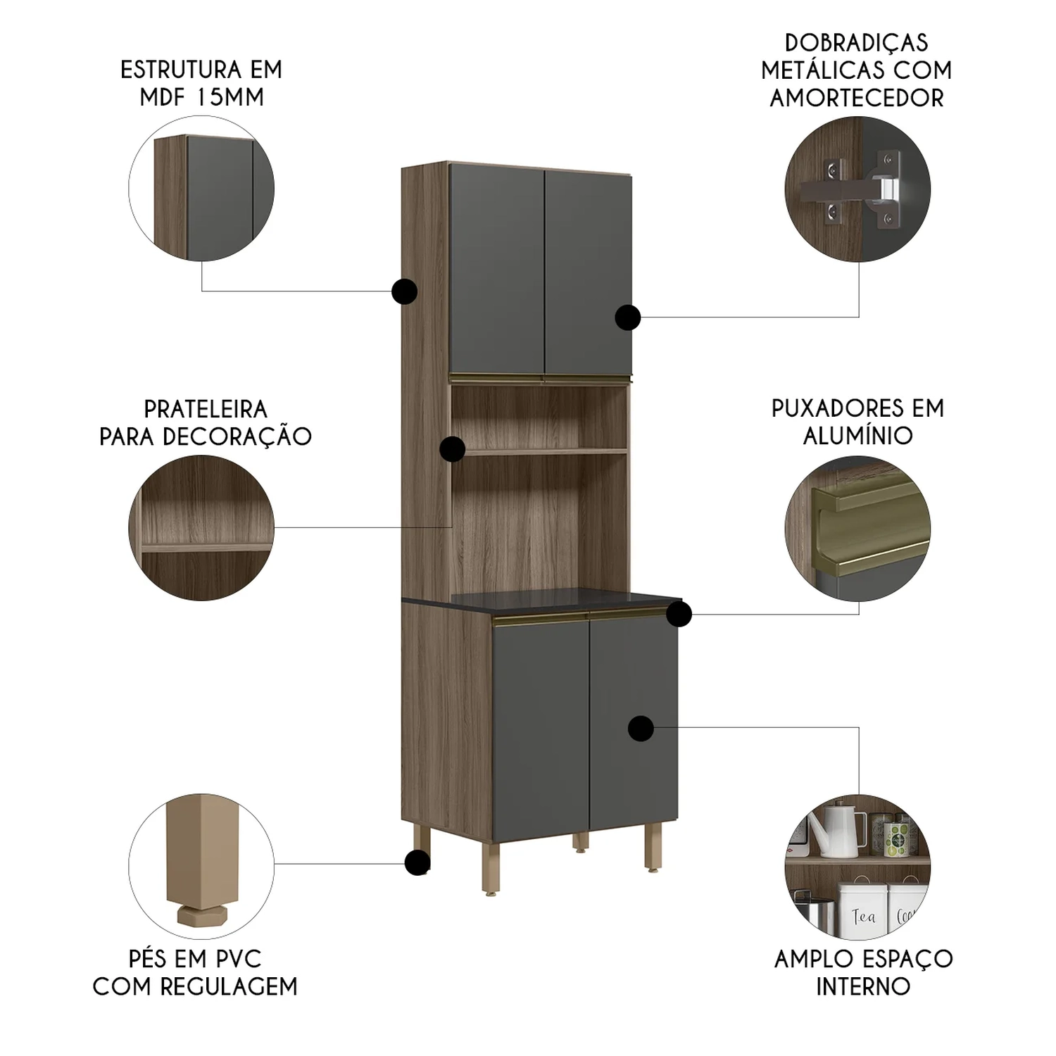 Com quatro portas no total, o Paneleiro para Cozinha oferece um excelente espaço de armazenamento, enquanto as dobradiças metálicas com amortecedor garantem um fechamento suave e silencioso. A estrutura em MDF de 15mm assegura durabilidade e o acabamento em pintura UV protege o móvel contra desgaste e desbotamento. Os puxadores de alumínio adicionam um toque de sofisticação e são resistentes. O nicho para forno ou micro-ondas e o nicho menor acima são perfeitos para manter os eletrodomésticos e condimentos organizados e facilmente acessíveis, otimizando o espaço e contribuindo para uma cozinha mais funcional e harmoniosa.