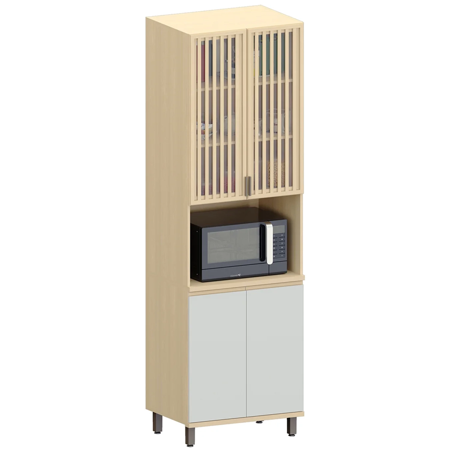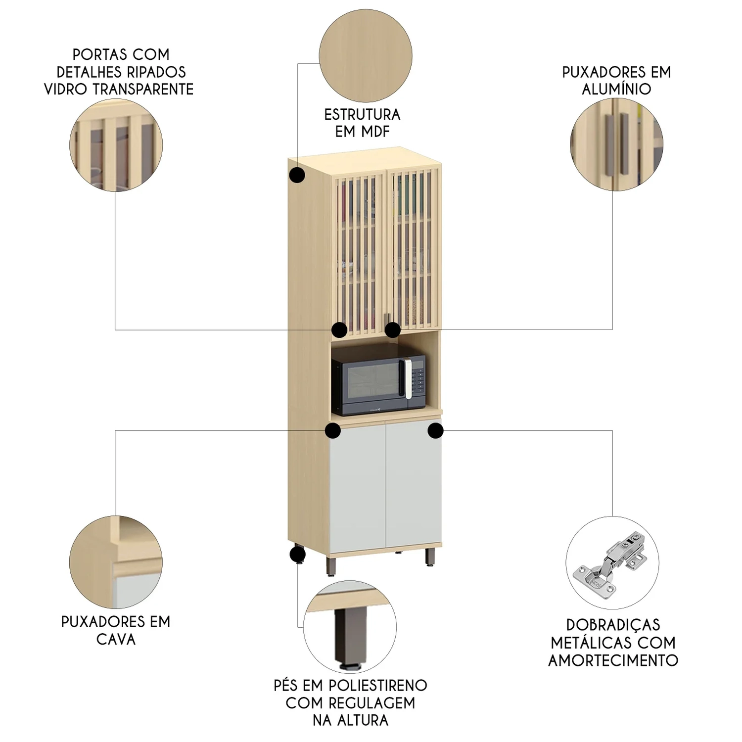 As portas com dobradiças metálicas do Paneleiro de Cozinha garantem um fechamento suave e sem ruídos. O detalhe ripado e o vidro nas portas superiores trazem um toque de elegância, ideal para exibir itens com charme.