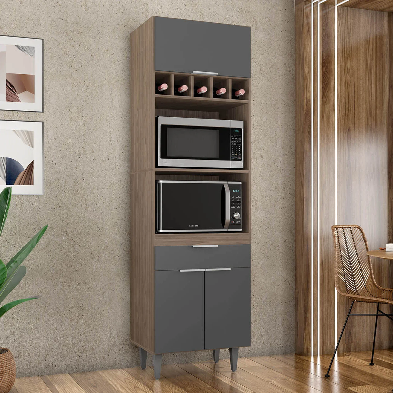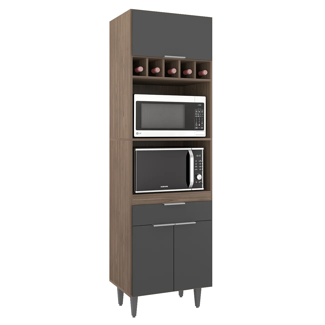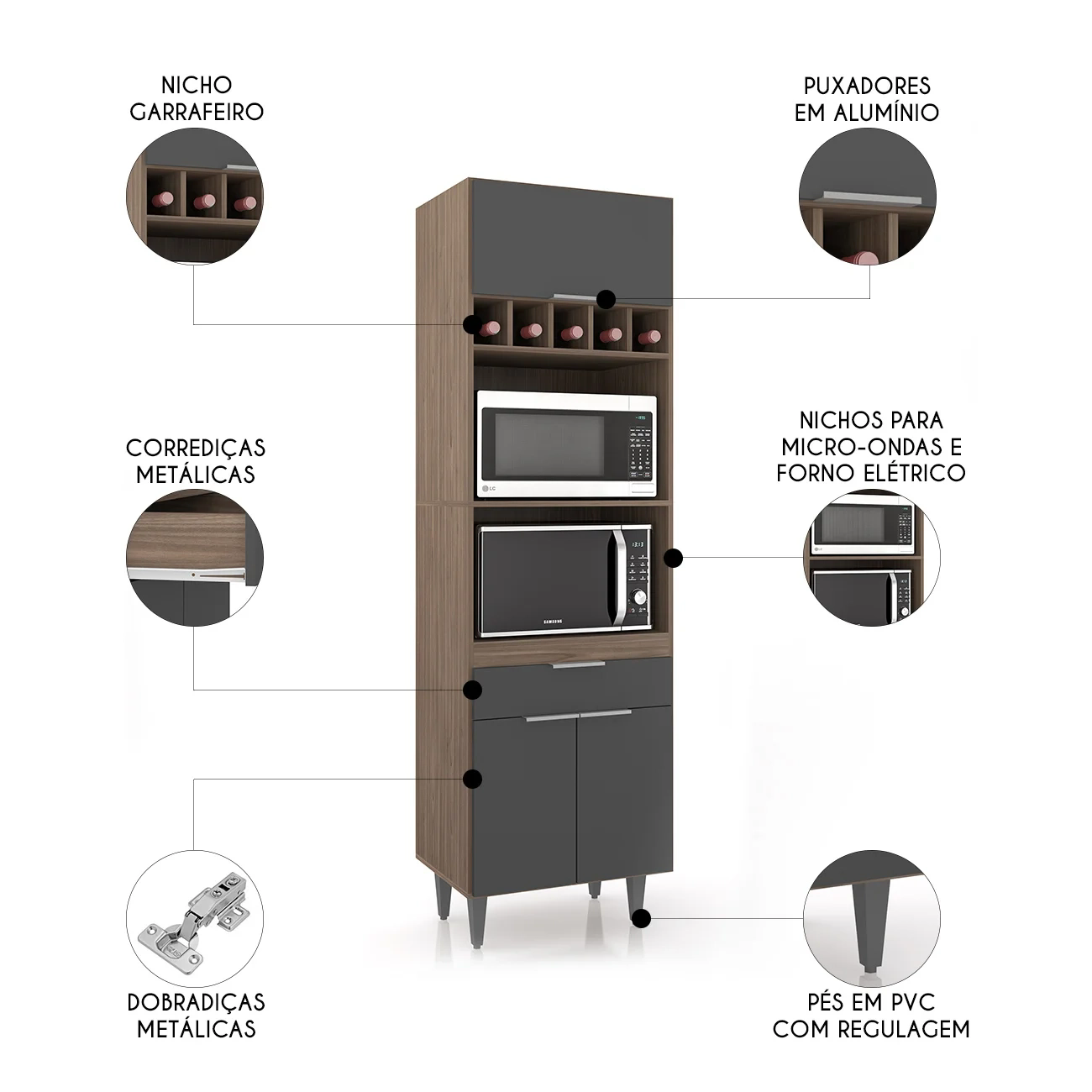 Ele conta com duas portas convencionais e uma porta basculante, todas com dobradiças metálicas, que garantem uma abertura suave. A gaveta, por sua vez, é equipada com corrediças metálicas, oferecendo facilidade no uso. Os puxadores em alumínio trazem um toque de sofisticação ao ambiente. Com amplo espaço para armazenamento, o Paneleiro Torre Quente possui dois nichos centrais para micro-ondas e forno elétrico, além de cinco nichos menores na parte superior, ideais para acomodar bebidas, objetos decorativos ou outros utensílios de sua preferência. A área interna é perfeita para organizar panelas, louças e utensílios de cozinha, de maneira eficiente. Fabricado em MDP 15mm, com acabamento em BP, proporciona maior resistência e durabilidade, prolongando a vida útil do Paneleiro de Cozinha. Os pés em PVC, são reguláveis, permitindo ajustar pequenos desníveis de piso e manter a estabilidade do produto.