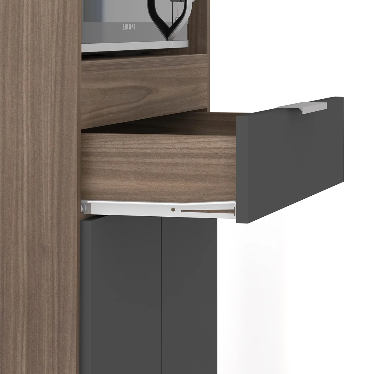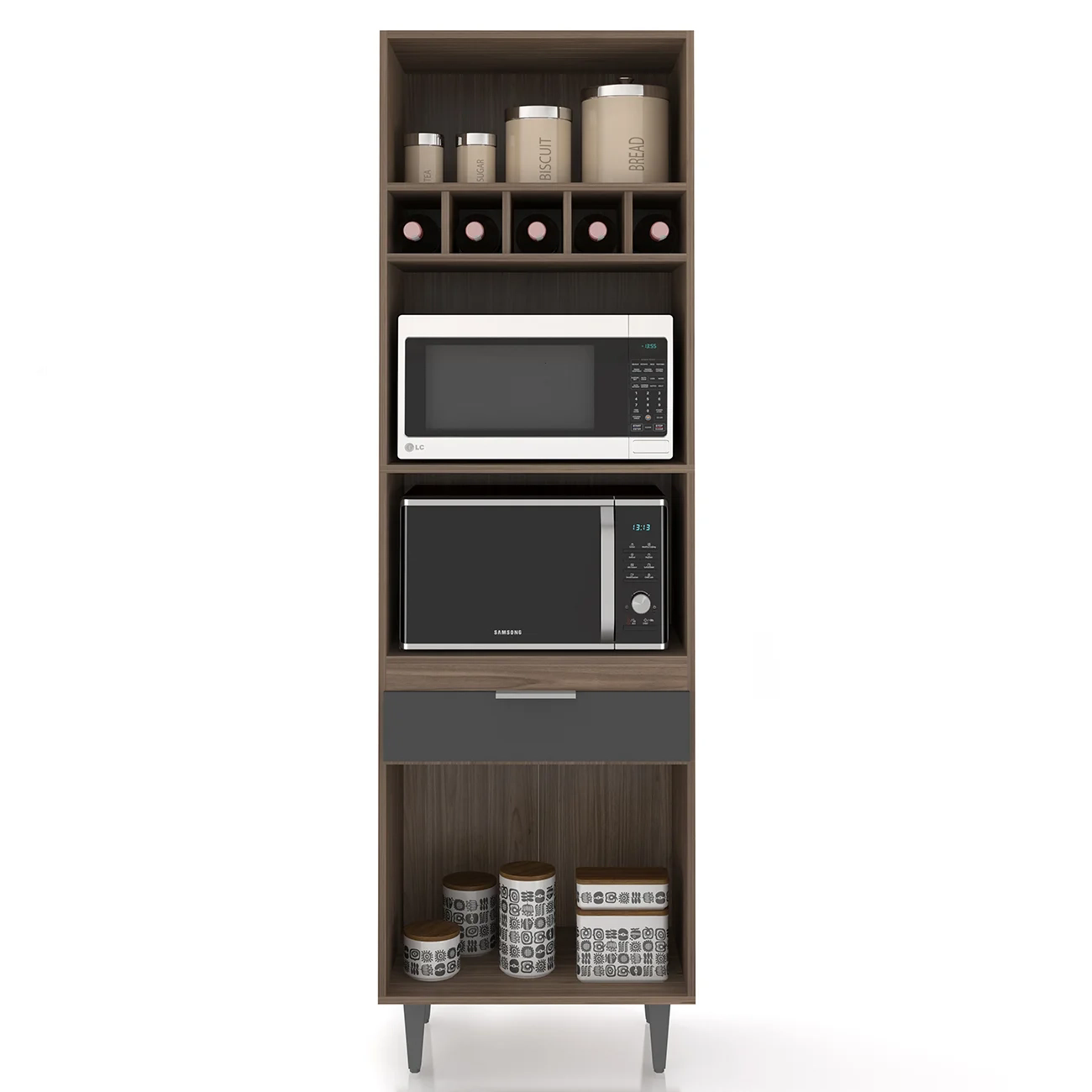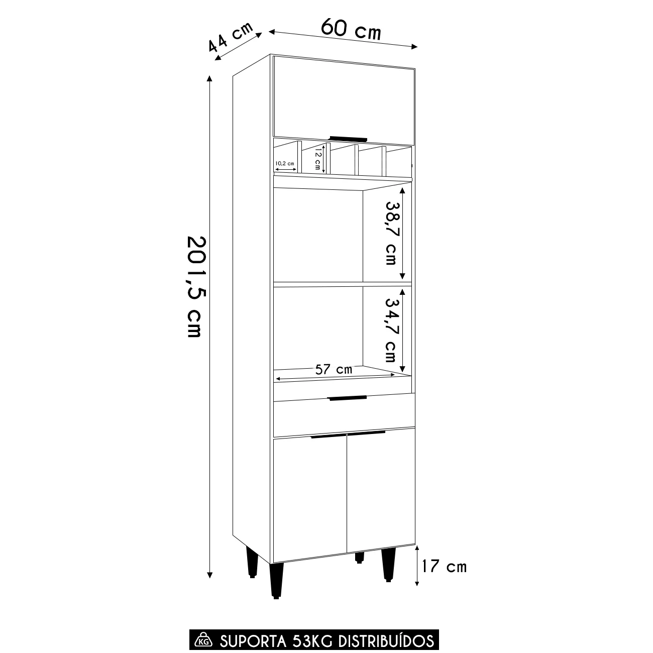 Ele conta com duas portas convencionais e uma porta basculante, todas com dobradiças metálicas, que garantem uma abertura suave. A gaveta, por sua vez, é equipada com corrediças metálicas, oferecendo facilidade no uso. Os puxadores em alumínio trazem um toque de sofisticação ao ambiente. Com amplo espaço para armazenamento, o Paneleiro Torre Quente possui dois nichos centrais para micro-ondas e forno elétrico, além de cinco nichos menores na parte superior, ideais para acomodar bebidas, objetos decorativos ou outros utensílios de sua preferência. A área interna é perfeita para organizar panelas, louças e utensílios de cozinha, de maneira eficiente. Fabricado em MDP 15mm, com acabamento em BP, proporciona maior resistência e durabilidade, prolongando a vida útil do Paneleiro de Cozinha. Os pés em PVC, são reguláveis, permitindo ajustar pequenos desníveis de piso e manter a estabilidade do produto.