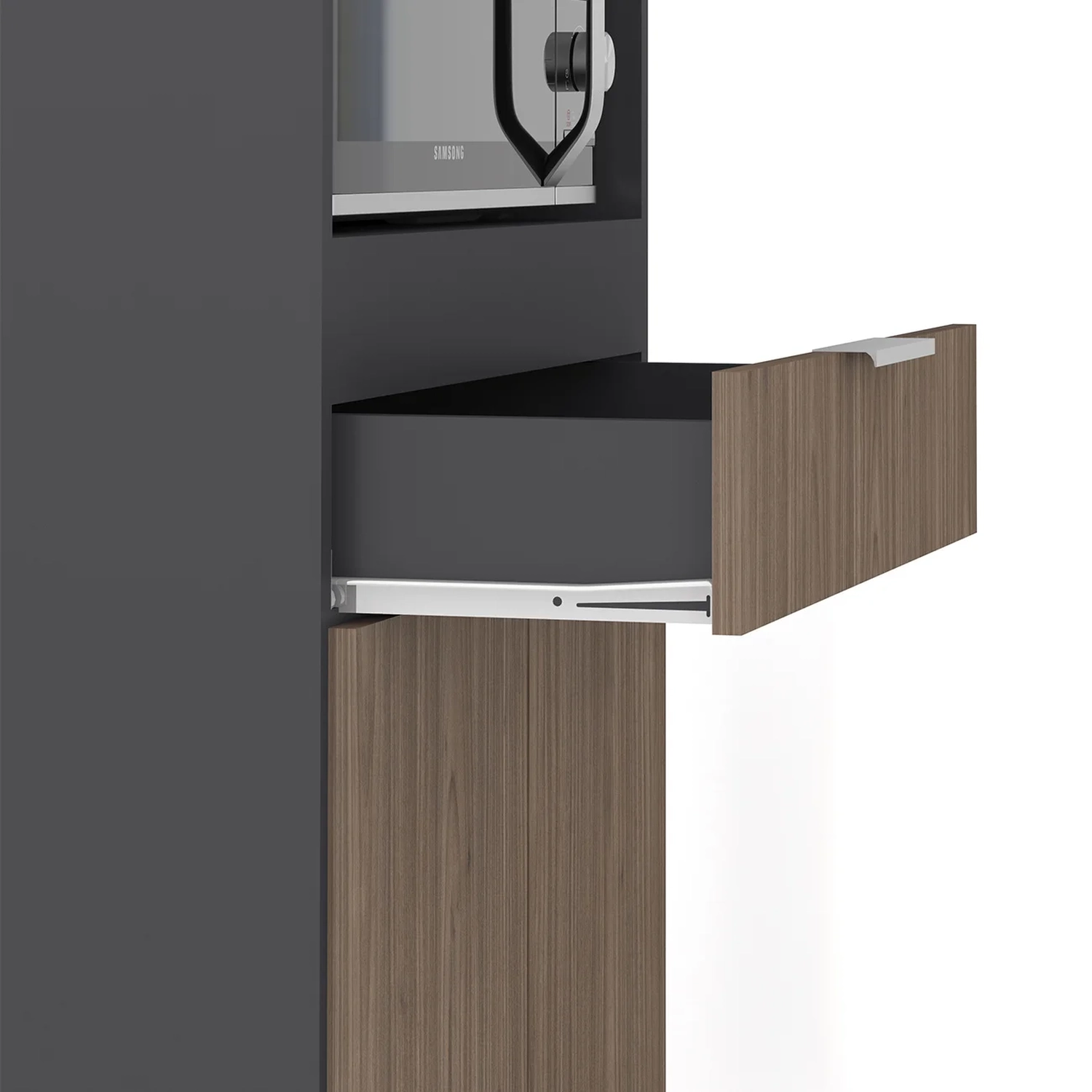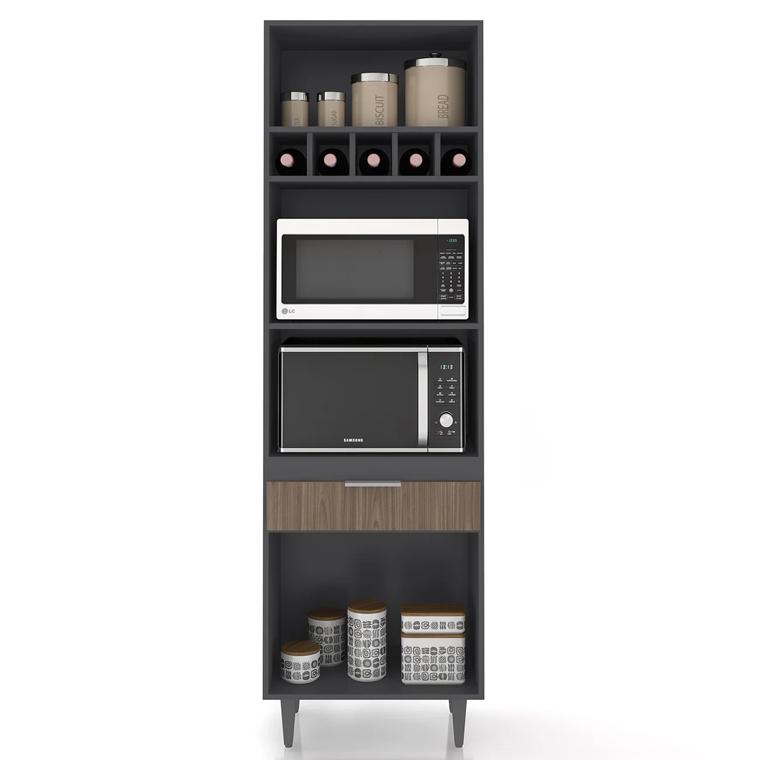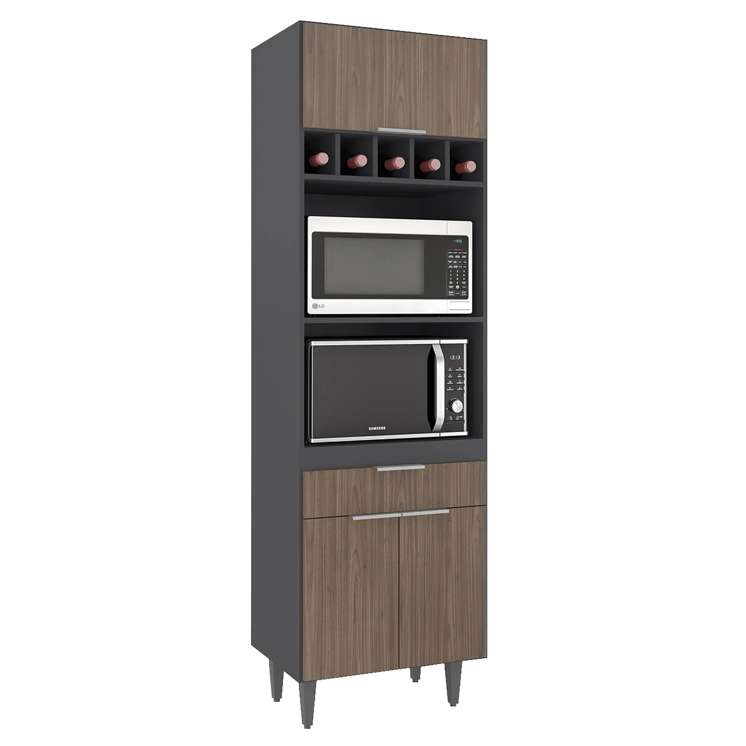 Ele conta com duas portas convencionais e uma porta basculante, todas com dobradiças metálicas, que garantem uma abertura suave. A gaveta, por sua vez, é equipada com corrediças metálicas, oferecendo facilidade no uso. Os puxadores em alumínio trazem um toque de sofisticação ao ambiente. Com amplo espaço para armazenamento, o Paneleiro Torre Quente possui dois nichos centrais para micro-ondas e forno elétrico, além de cinco nichos menores na parte superior, ideais para acomodar bebidas, objetos decorativos ou outros utensílios de sua preferência. A área interna é perfeita para organizar panelas, louças e utensílios de cozinha, de maneira eficiente. Fabricado em MDP 15mm, com acabamento em BP, proporciona maior resistência e durabilidade, prolongando a vida útil do Paneleiro de Cozinha. Os pés em PVC, são reguláveis, permitindo ajustar pequenos desníveis de piso e manter a estabilidade do produto.