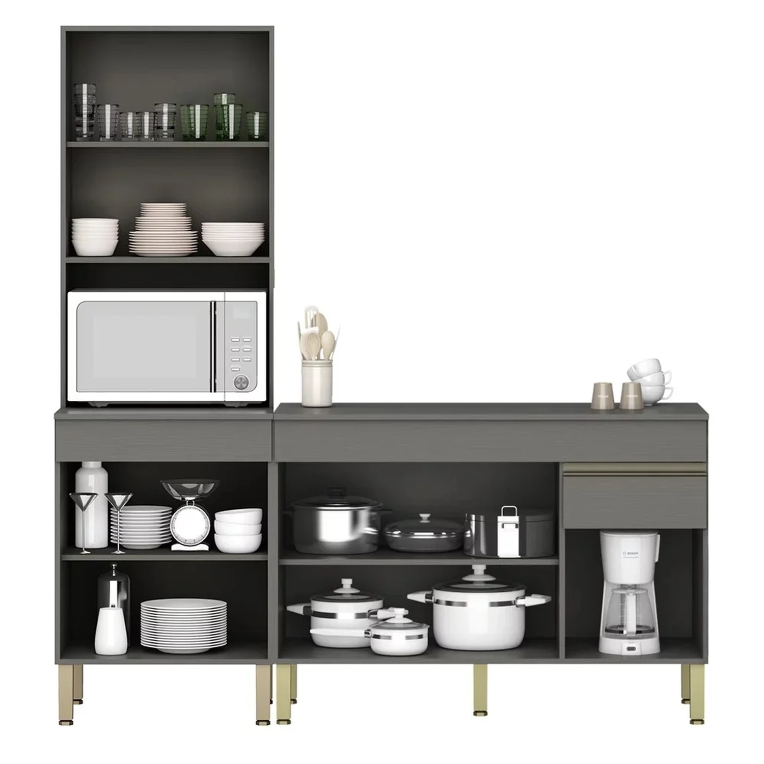 São móveis práticos e funcionais para a Cozinha. O Paneleiro Torre Quente e o Balcão Gabinete Para Pia são excelentes para guardar utensílios, mantimentos, louças e eletrodomésticos com aproveitamento de espaço conta também com prateleira interna para melhor organização. Ah! E ele acompanha tampo, que pode auxiliar no preparo das refeições. Além disso, ele tem um design moderno e uma pintura UV, puxadores em alumínio, e dobradiças metálicas que garante maior durabilidade e resistência aos móveis.