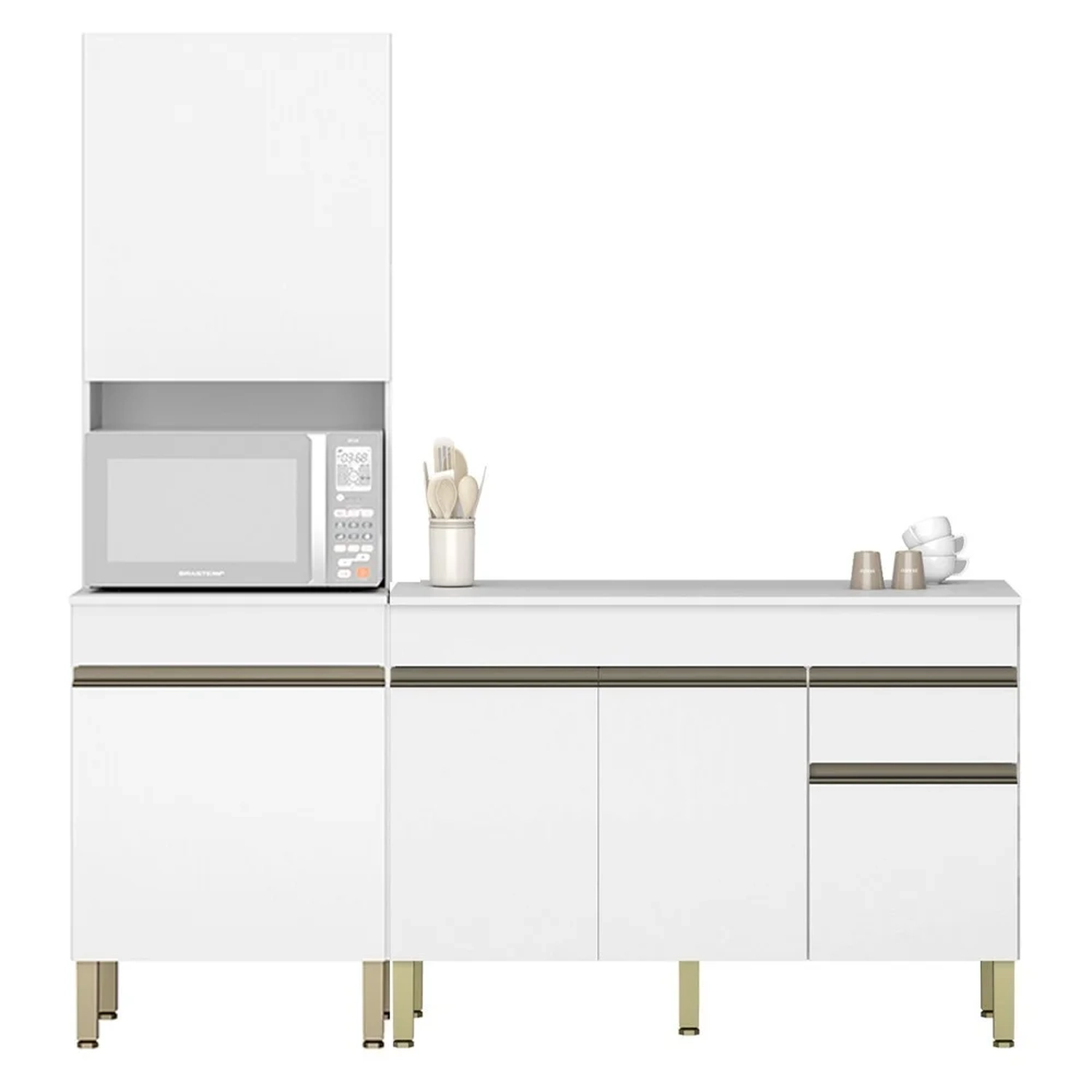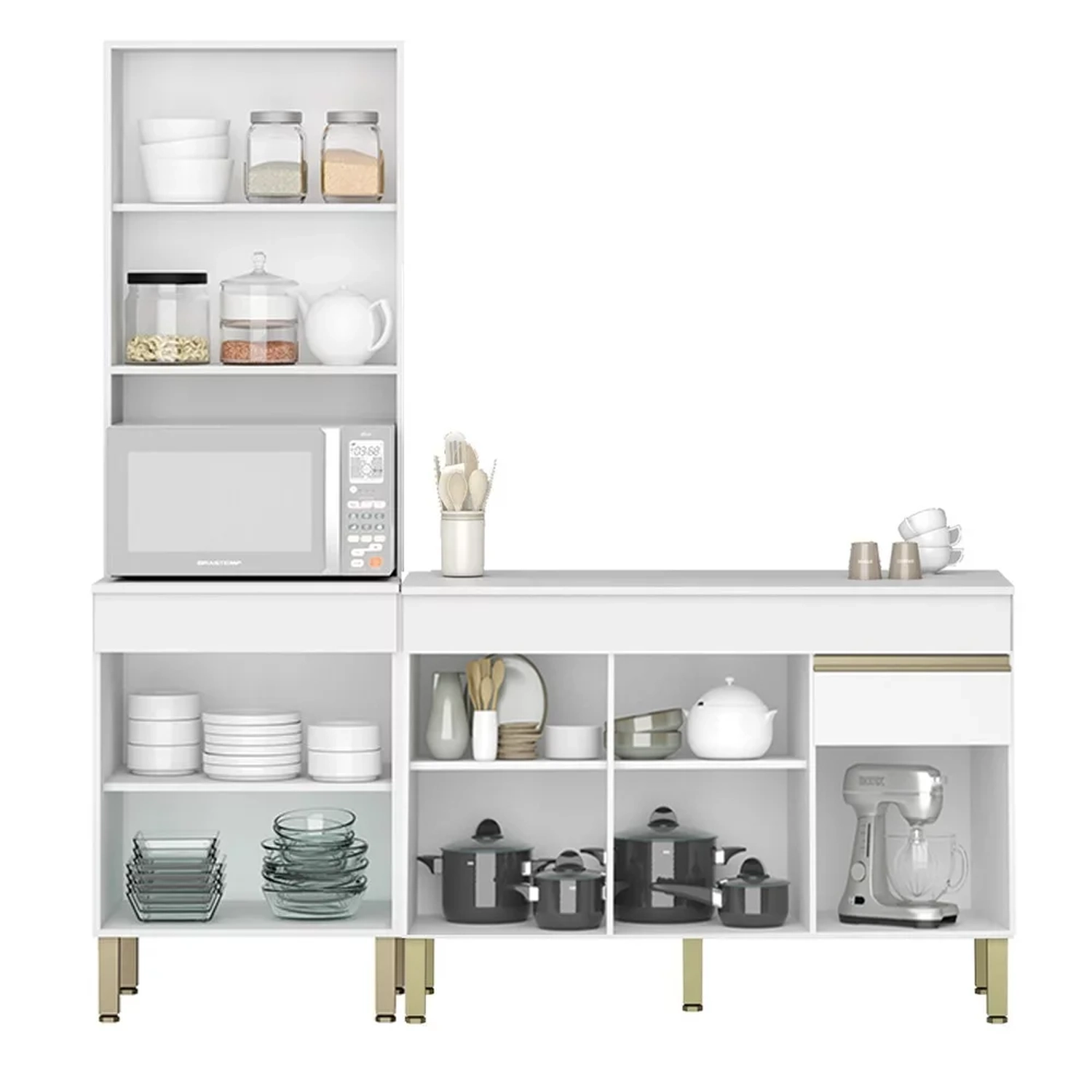 São móveis práticos e funcionais para a Cozinha. O Paneleiro Torre Quente e o Balcão Gabinete Para Pia são excelentes para guardar utensílios, mantimentos, louças e eletrodomésticos com aproveitamento de espaço conta também com prateleira interna para melhor organização. Ah! E ele acompanha tampo, que pode auxiliar no preparo das refeições. Além disso, ele tem um design moderno e uma pintura UV, puxadores em alumínio, e dobradiças metálicas que garante maior durabilidade e resistência aos móveis.