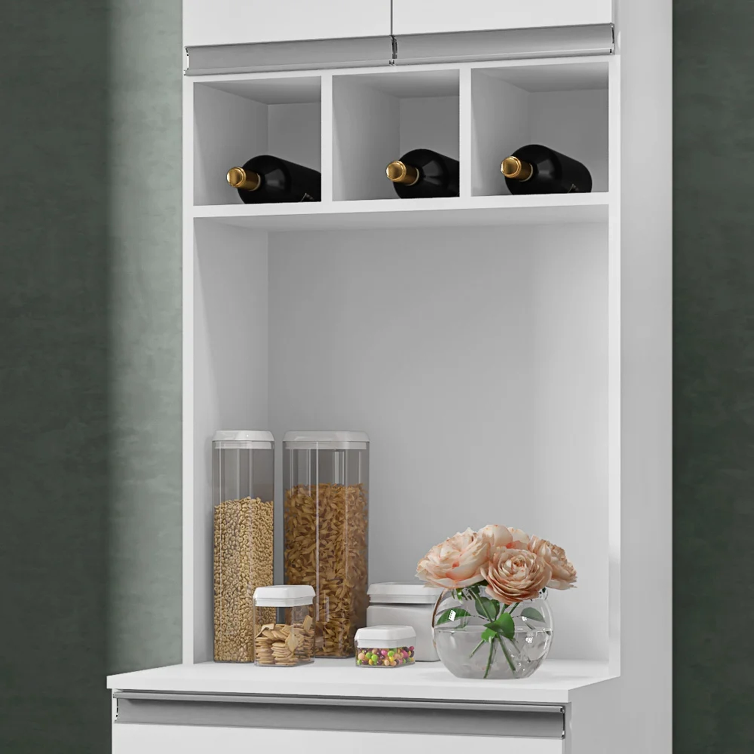 O Paneleiro é feito de MDP de alta qualidade, com acabamento em pintura UV que garante maior durabilidade e resistência. Este Paneleiro Torre Quente possui 4 portas com dobradiças metálicas, sendo duas superiores e duas inferiores, com 2 prateleiras que oferecem ótimo espaço interno para você guardar seus utensílios, louças e mantimentos. Ele também possui 1 gaveta com corrediças metálicas, que facilita a abertura e o fechamento, ideal para guardar talheres e outros objetos menores. Além disso, ele tem 1 nicho central para você colocar seu forno elétrico, seu micro-ondas e ainda 3 nichos menores para decorar o com plantas ou objetos.
