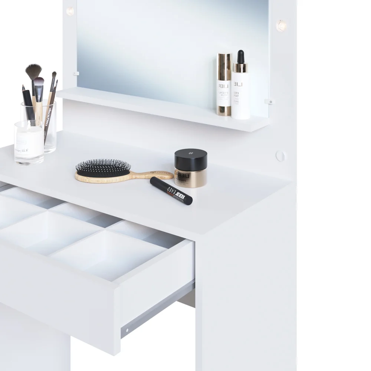 É sempre bom depois de um dia ou uma semana atarefada, poder tirar aquele momento terapêutico para cuidar de si, não é mesmo? E nessa hora, o ambiente também contribui e muito! Por isso, pensando em conferir um ambiente aconchegante e funcional, apresentamos a Penteadeira Camarim Star! Ela possui espelho emoldurado por lâmpadas de LED, amplo espaço no tampo para seus acessórios, pincéis e o melhor: uma gaveta organizadora! Sim, com esse design super funcional, ajuda a otimizar o tempo, dispondo suas maquiagens e produtos de madeira dinâmica e de fácil visualização! Inclusive, toda fabricada em MDP com acabamento em pintura finish foil!