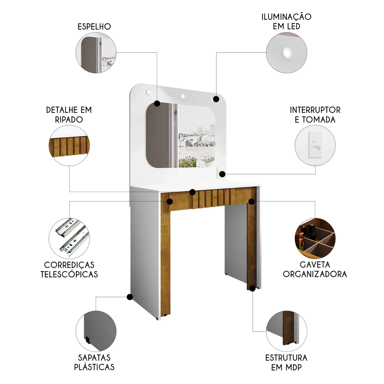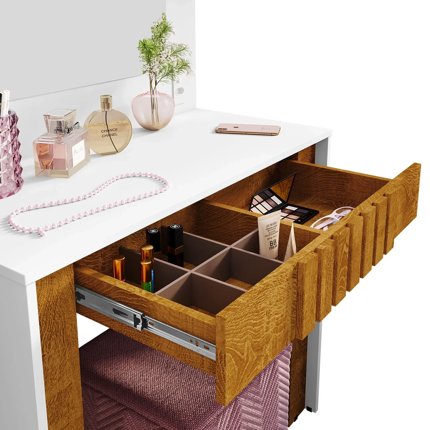 A gaveta organizadora ripada da Penteadeira possui corrediças telescópicas que proporciona abertura suave e total, facilitando o uso e oferecendo espaço ideal para manter os itens bem organizados.