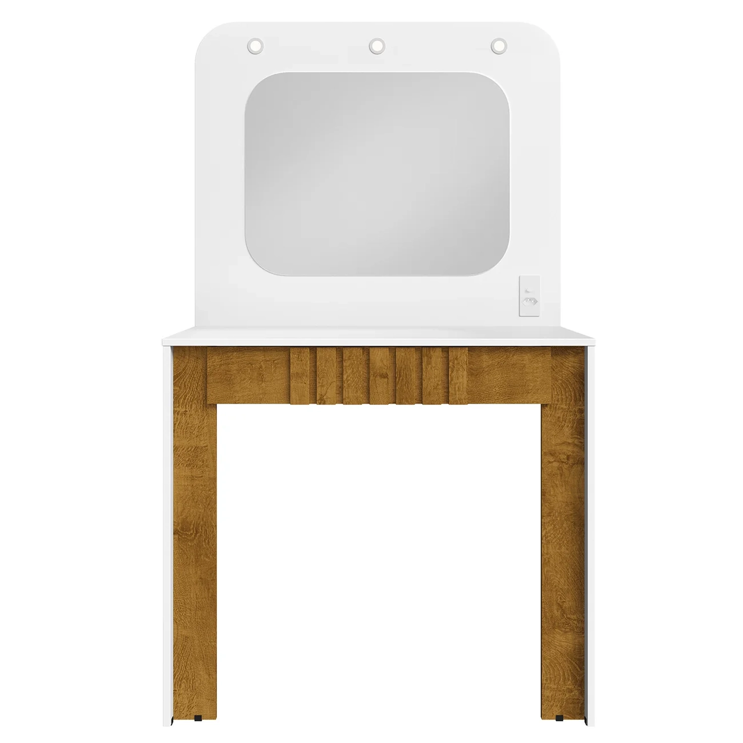 A Penteadeira Com Espelho conta com três luminárias LED que proporcionam uma iluminação suave e eficiente, ideal para maquiagem e cuidados com a pele. A luz bem distribuída valoriza sua rotina de autocuidado, enquanto a tomada com interruptor integrado oferece mais praticidade para o uso de aparelhos elétricos ou recarga de dispositivos.