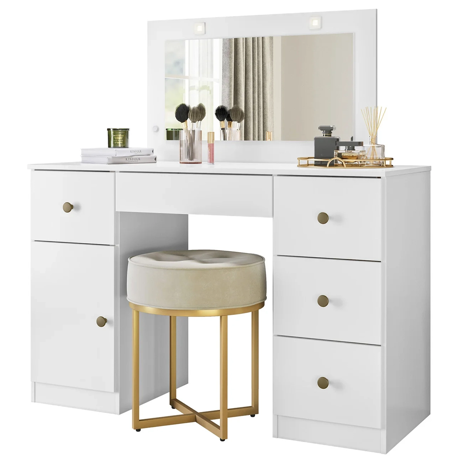 Além disso, a Penteadeira possui um belíssimo painel com espelho que permite uma visão ampla e clara e iluminação LED integrada que proporciona uma luz suave e uniforme, ideal para maquiagem e outros cuidados.