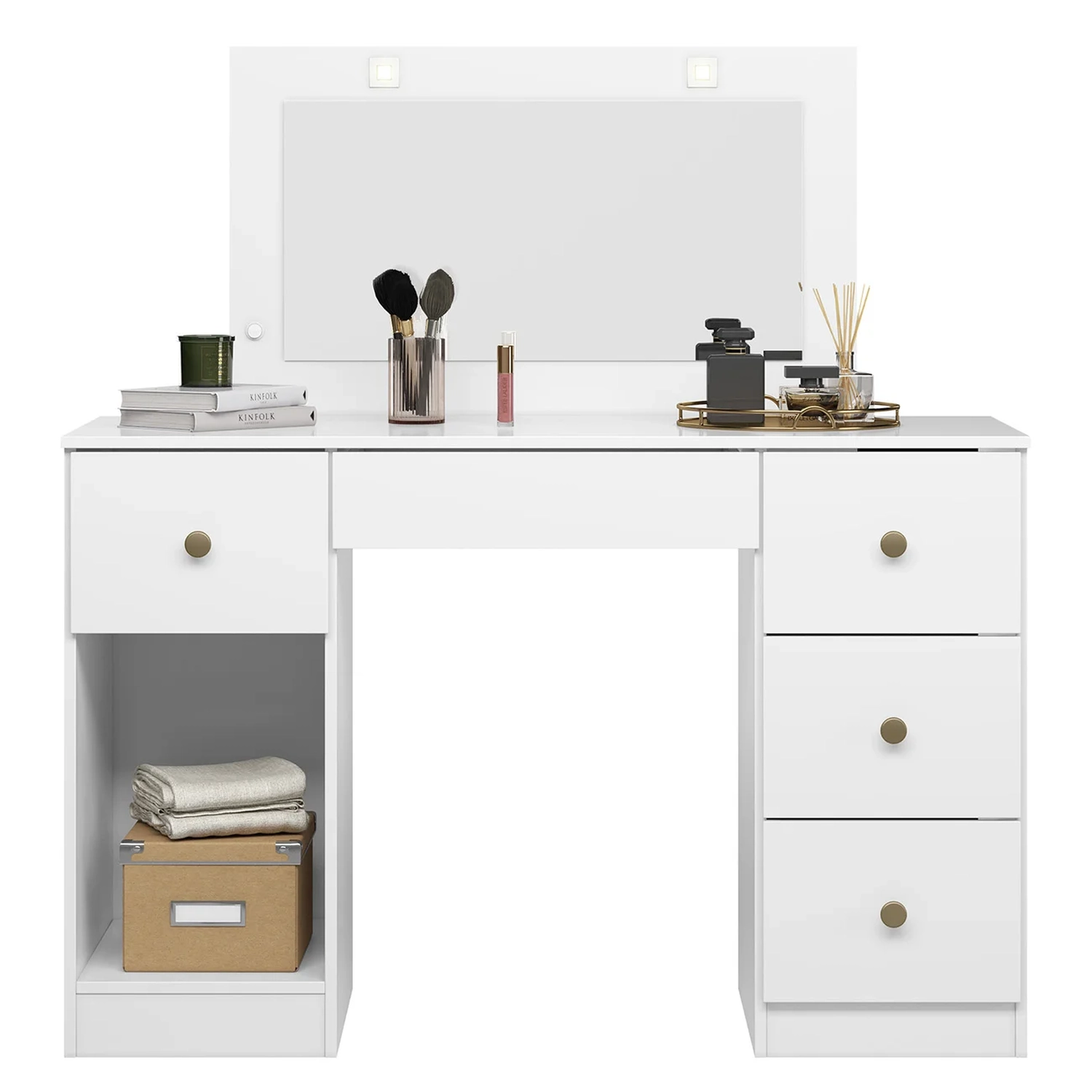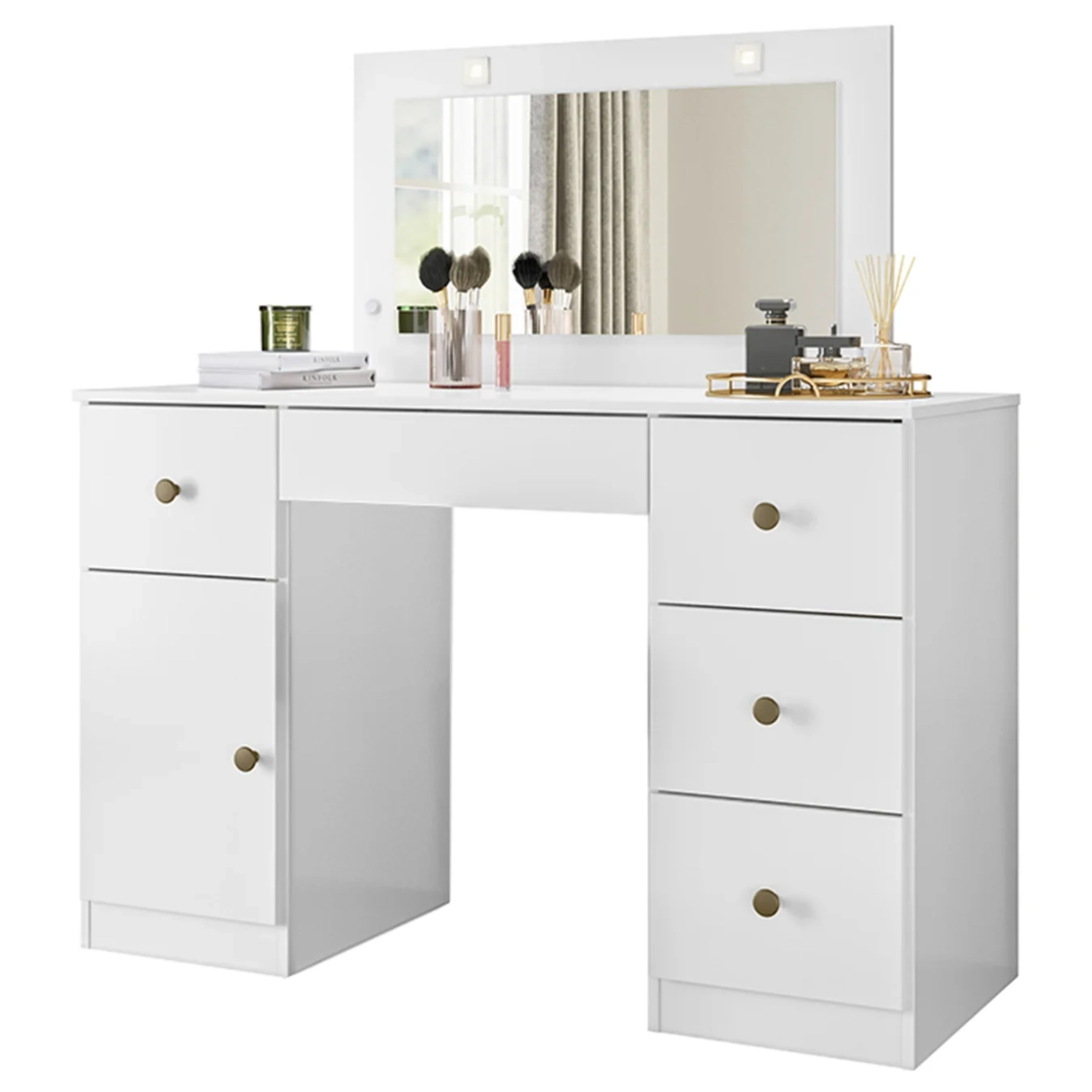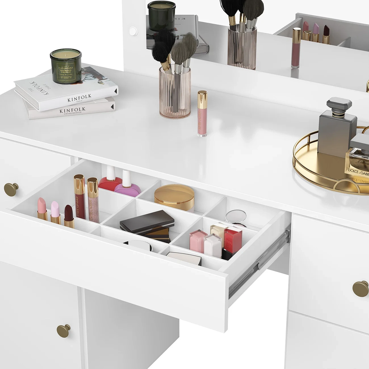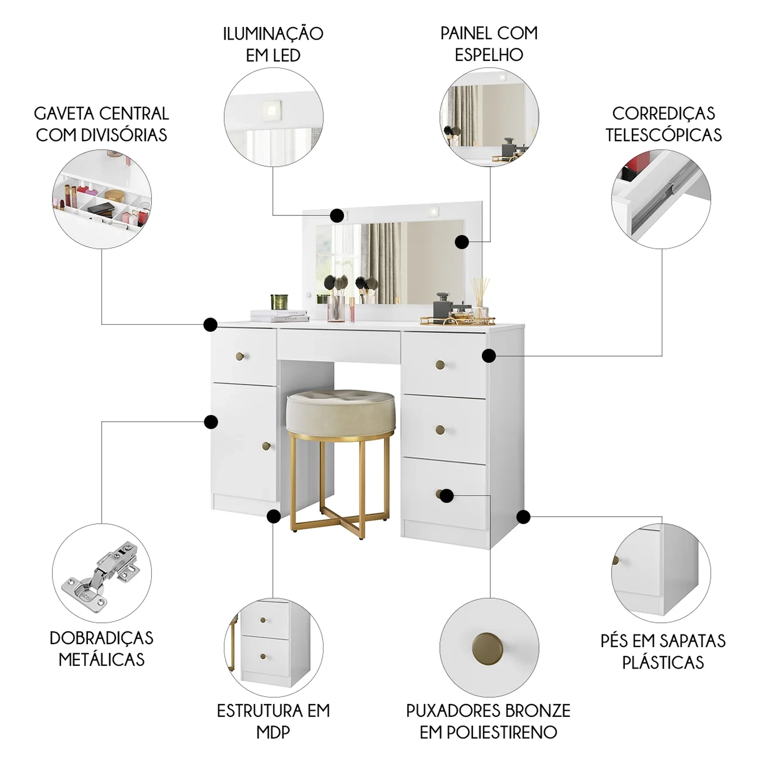 Produzida em MDP de 12 e 15mm com acabamento em pintura UV de alta qualidade, garante resistência e durabilidade por muito mais tempo. A Penteadeira Camarim conta com uma porta com dobradiças metálicas, puxadores em poliestireno e cinco gavetas com corrediças telescópicas, sendo a gaveta central equipada com um divisor incluso para melhor disposição dos itens, oferecendo praticidade e eficiência e permitindo armazenar seus produtos de beleza, como maquiagens, perfumes e cremes, de forma acessível e bem organizada.